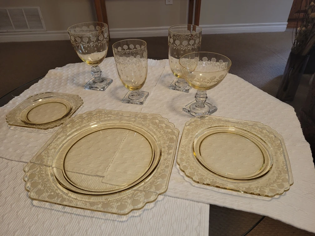 Selling a beautiful set of vintage Jeannette Glass Windsor Amber Prescut dishes! This set includes various pieces, perfect for adding a touch of retro elegance to your table. The amber colour and intricate design make these dishes a unique and charming addition to any collection