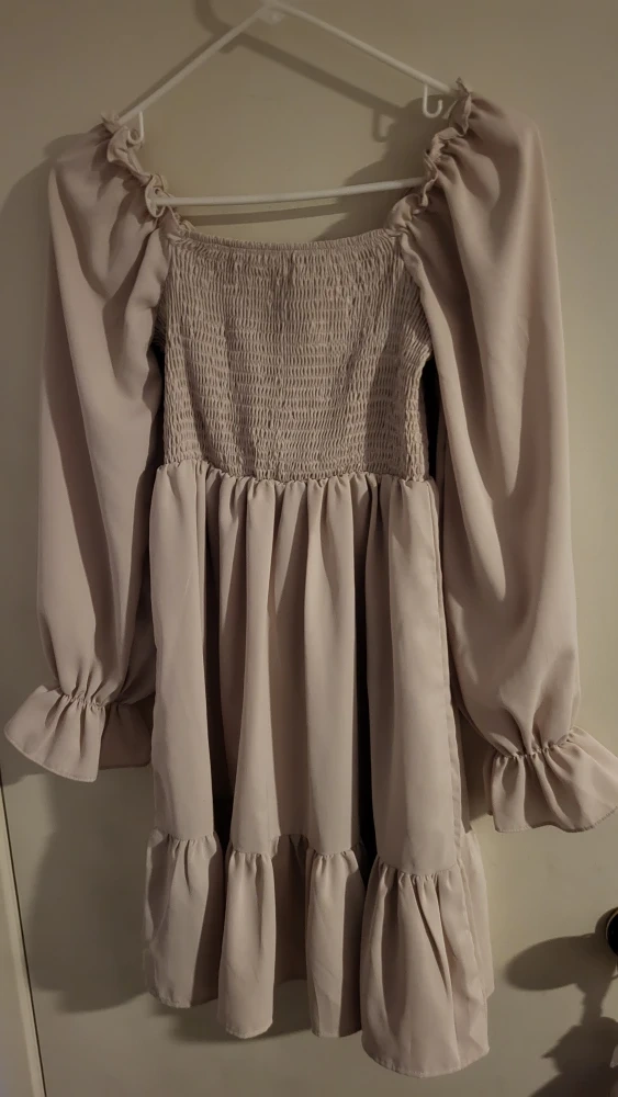 Selling a lovely beige mini dress with long sleeves! It's in great condition and perfect for a casual outing or a special occasion. The dress features a smocked bodice and a tiered skirt.