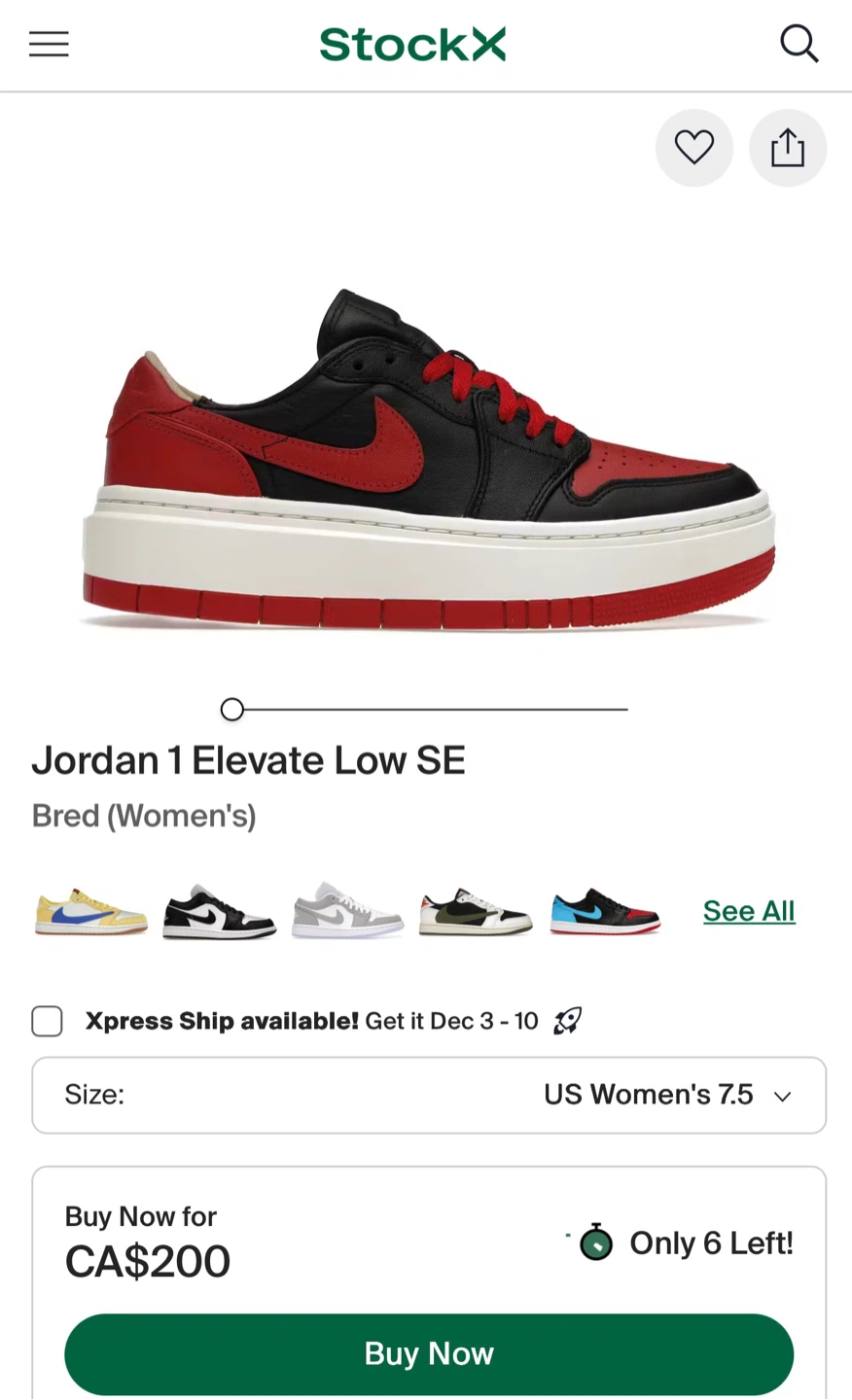 1 / 61 / 6Buy & SellJordan 1 Elevate Low SEJordan 1 Elevate Low SE$60Nike Jordan 1 Elevate Low. Great condition Women’s 8.5 size / 255mm No shoes boxConditionLike newWHERE TO MEET34 Wellesley St EView MapSELLERJDChurch Yonge Corridor27130 reviews1 chats·3 favorites·114 viewsSEND CHAT TO SELLERHi JD! I’m interested in your listing.Hi JD! I’m interested in your listing.Get the Karrot app to chatSign In to chat