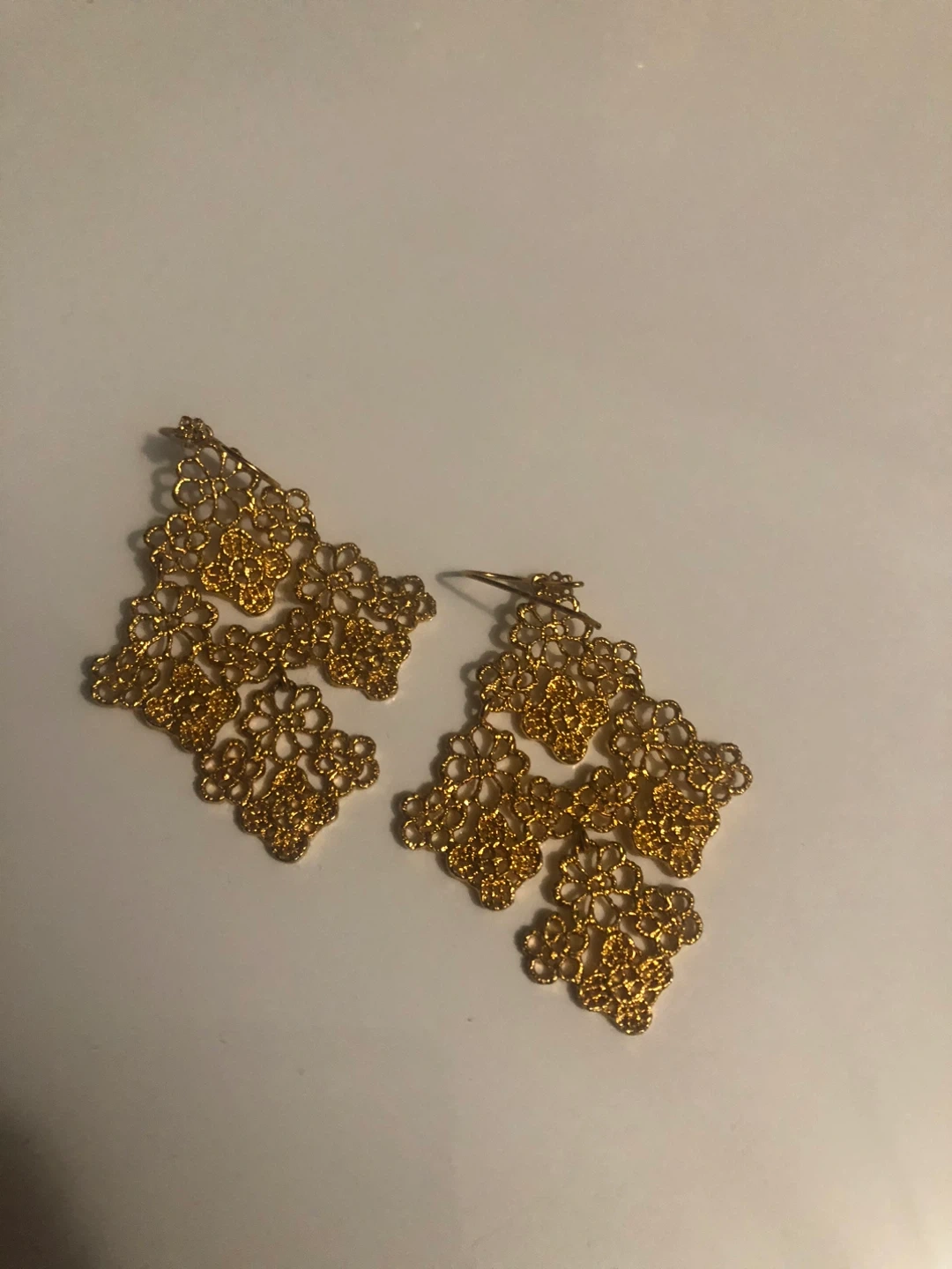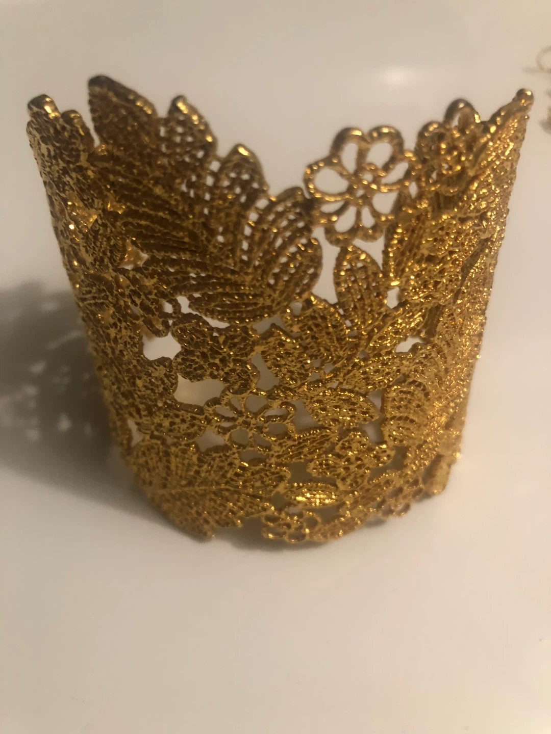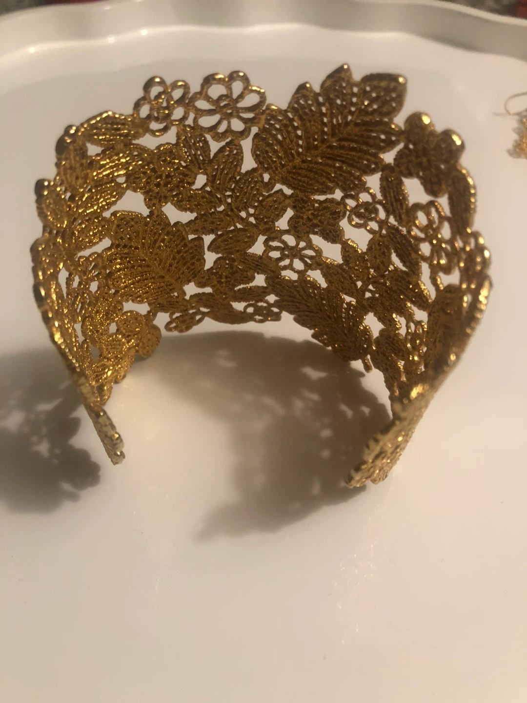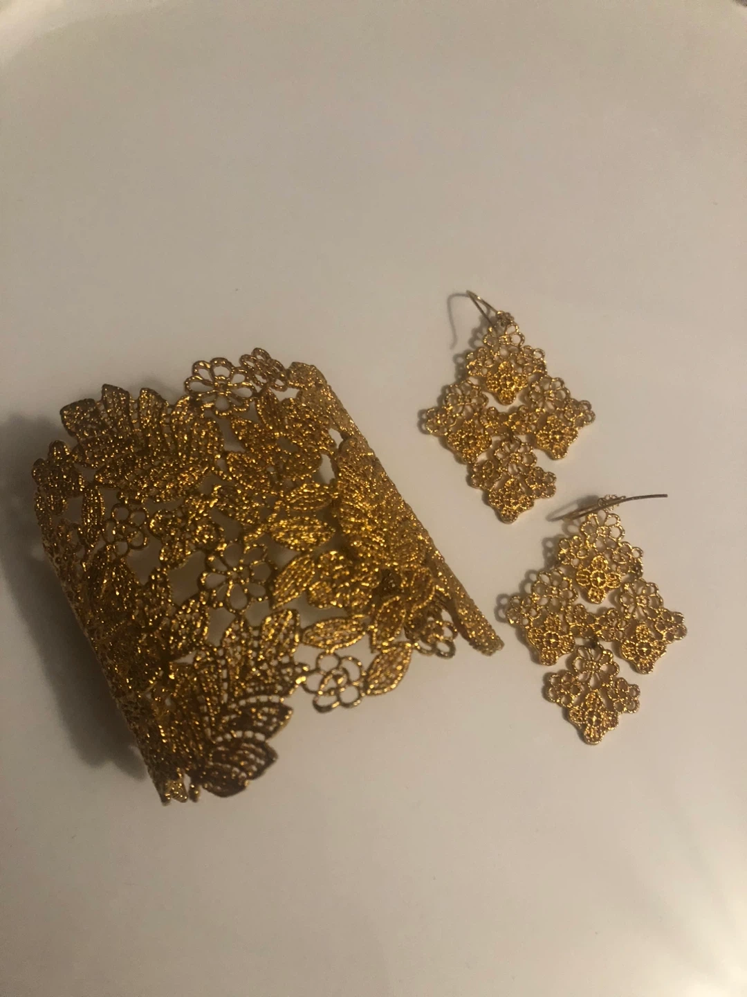 Selling a beautiful gold-toned cuff bracelet and matching earrings set. The intricate floral design makes it a lovely statement piece for any occasion. They are in excellent condition and ready to be enjoyed!