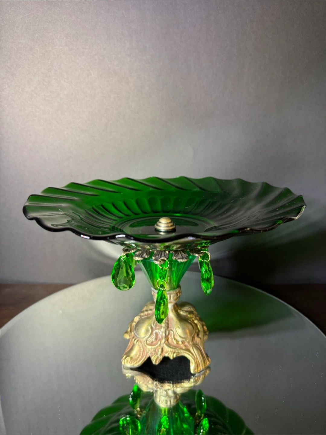 Here's a lovely vintage green glass and brass base dessert stand! It would be perfect for displaying cupcakes or other treats. High 6.5 inch,diameter 10 inch