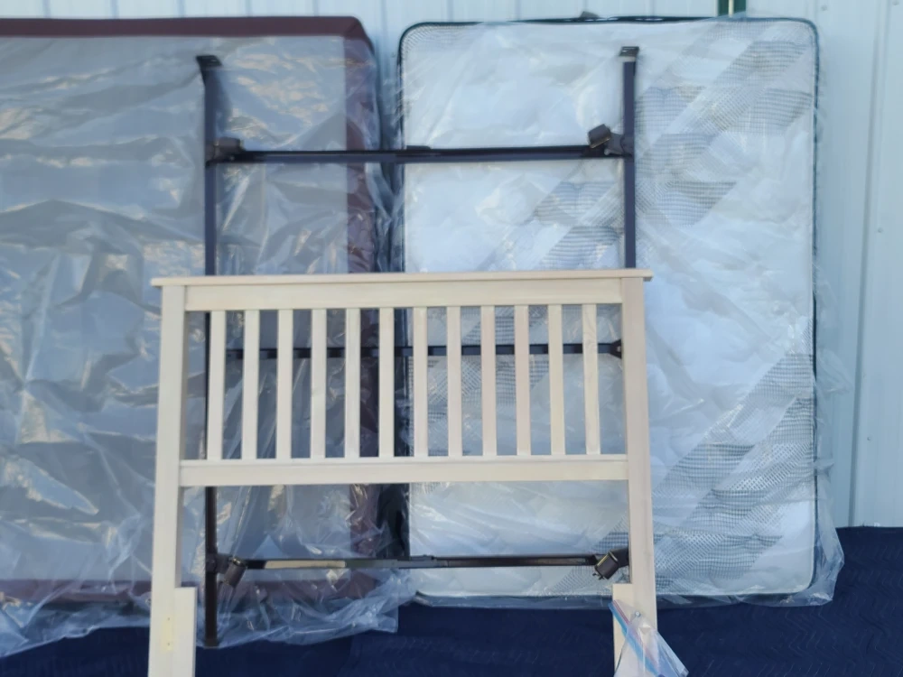 Gently used Queen size bedframe, mattress $ boxspring. It's in great condition and ready for a new home. Perfect for a guest room or anyone needing a comfortable sleep setup. Frame has a simple design and is made of light-colored wood. Viewing and pickup by appointment.