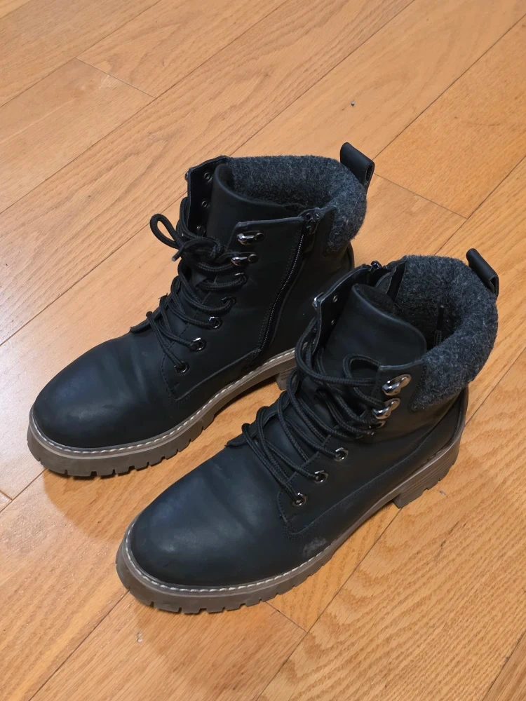 Selling a pair of v3ry good used condition, black Madden Girl boots! They have a lace-up front and a zipper on the side for easy wear. There are some signs of wear as pictured, but they're still in excellent condition for everyday use
