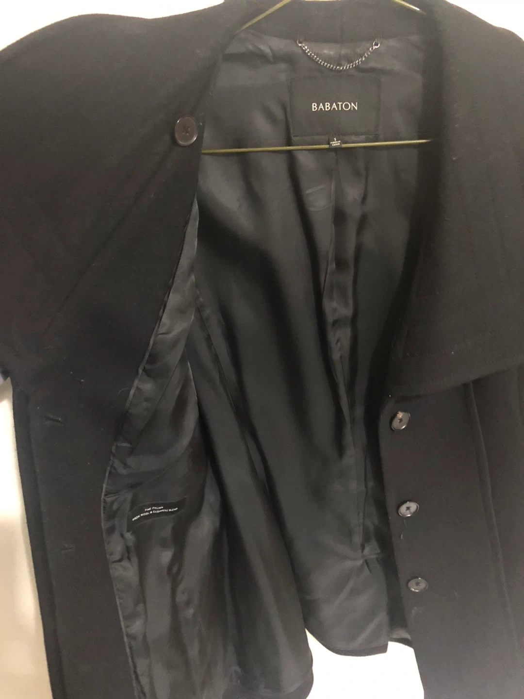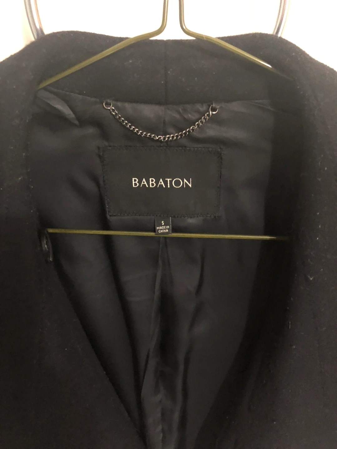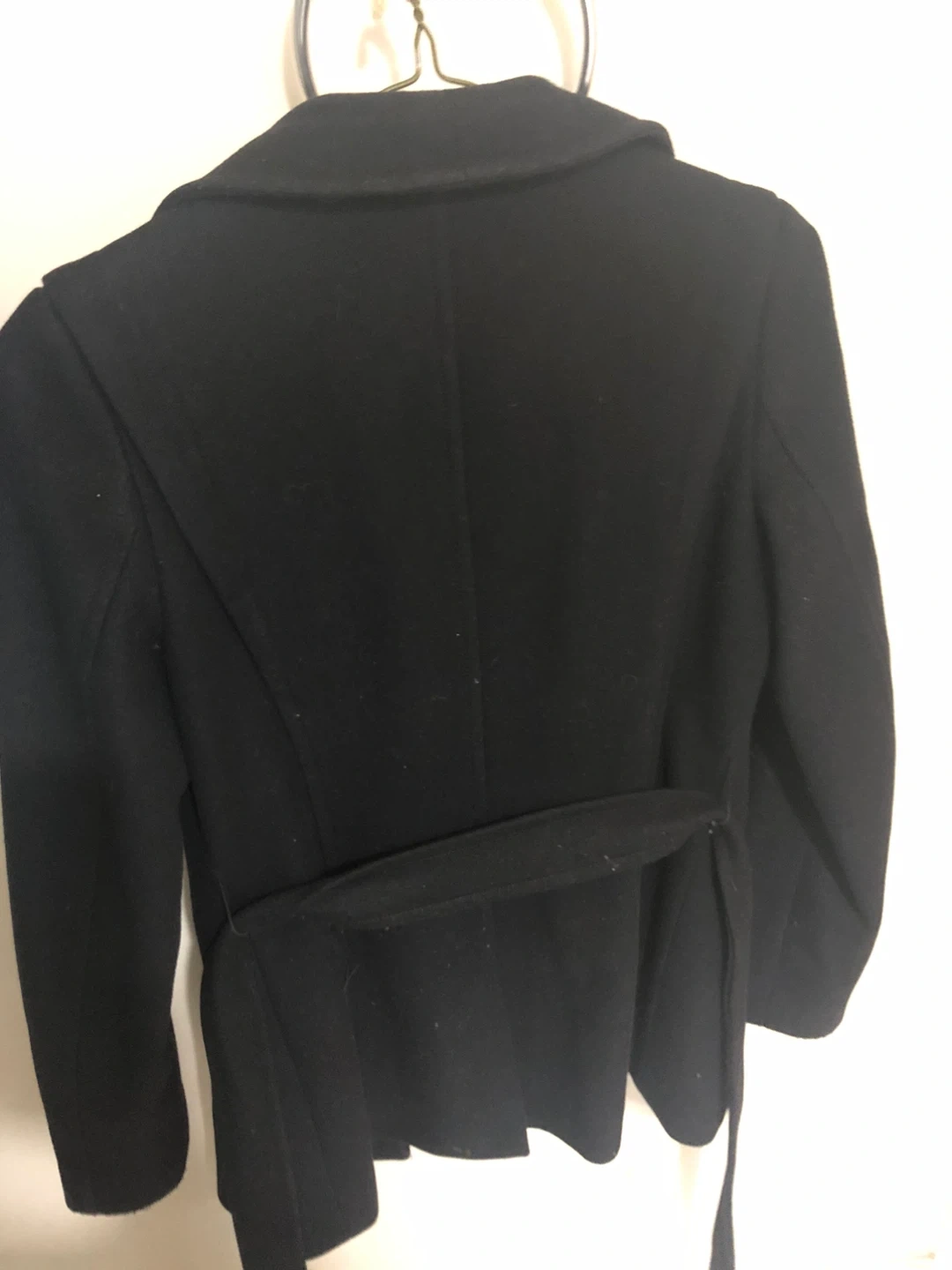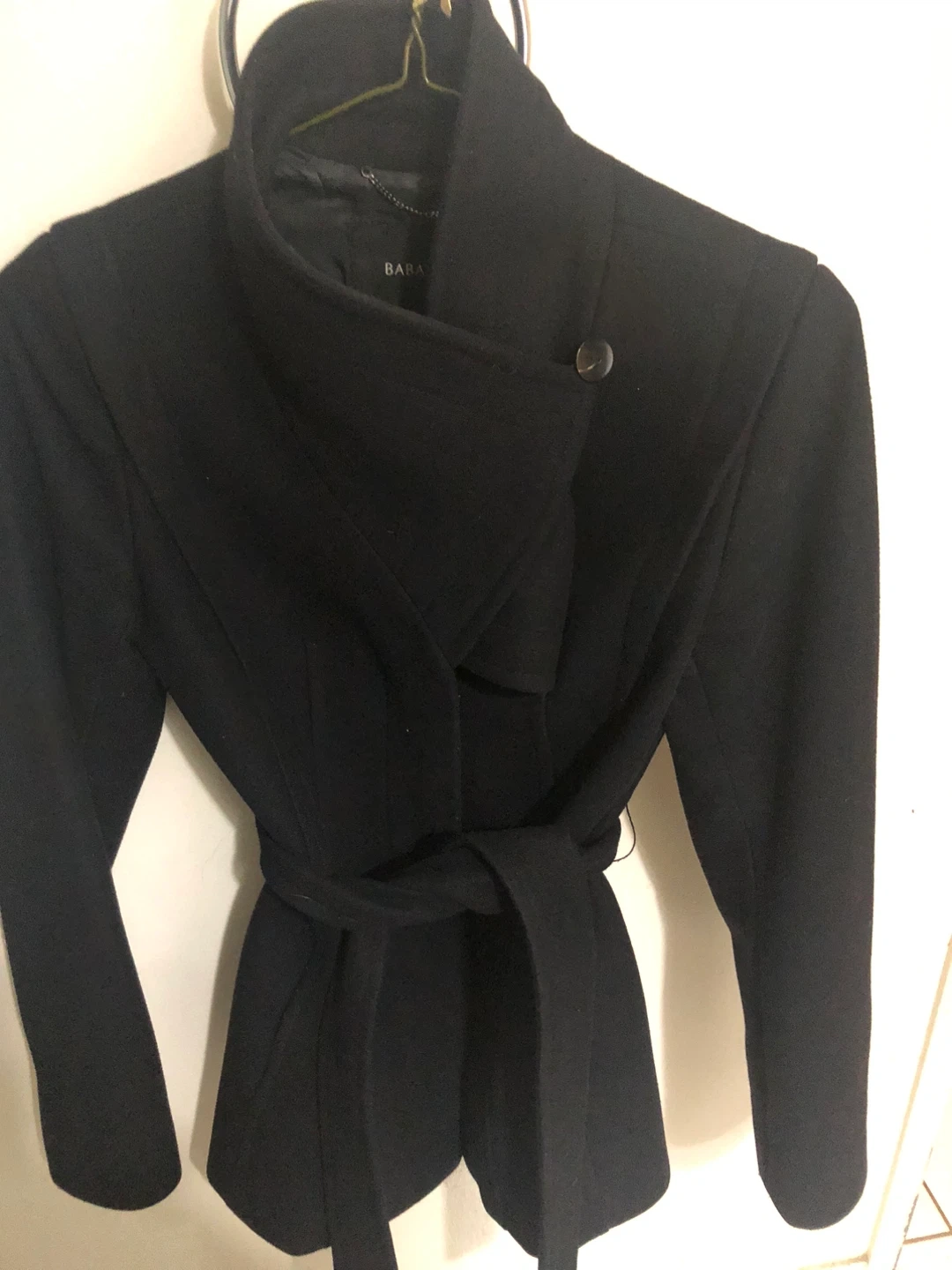 Selling a stylish Babaton black coat wool and cashmere blend in size small. It features a unique collar and a flattering belted waist. Perfect for adding a touch of sophistication to your wardrobe!