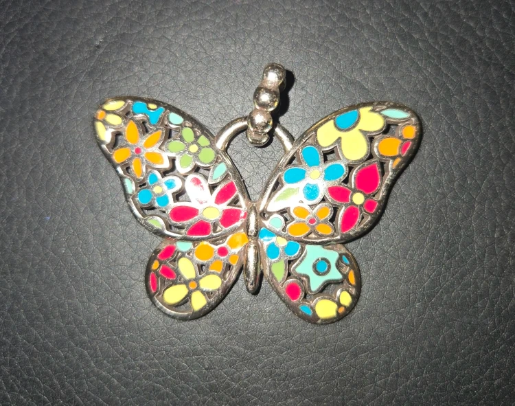 This is a lovely, colorful butterfly pendant. It features a beautiful floral design with vibrant colors like red, yellow, blue, and green. The pendant has a silver-tone finish and would make a great addition to any jewelry collection