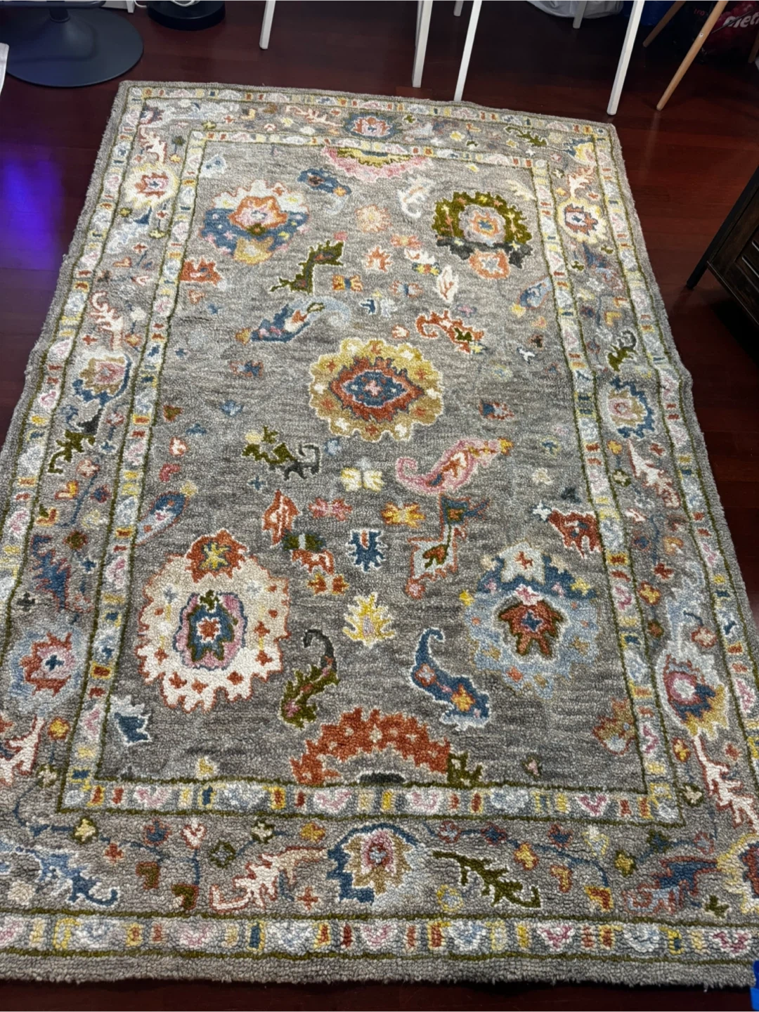 This Padma rug features a beautiful, intricate design and measures approximately 5 feet by 8 feet, making it a stylish addition to any room. The rug is in good condition, showcasing a blend of traditional patterns and modern colours that will enhance your home decor.