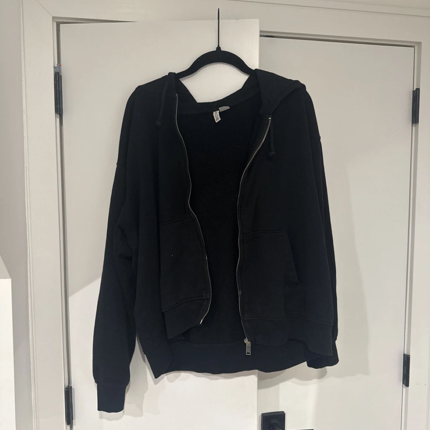 Selling a black zip-up hoodie from H&M! It's in great condition and ready for a new owner. The hoodie is a classic and versatile piece that can be worn for many occasions. It's perfect for layering or wearing on its own during cooler days. Feel free to reach out if you have any questions!