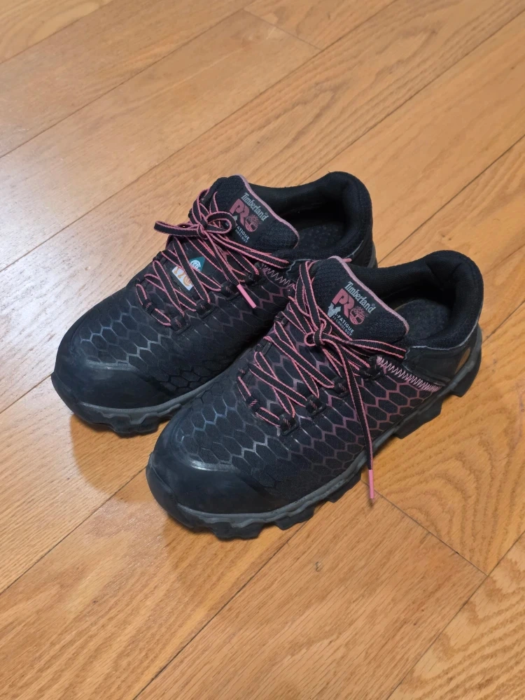 Selling a pair of Timberland PRO Women's Drivetrain shoes in black with pink accents. They appear to be in good condition, perfect for work or everyday wear!