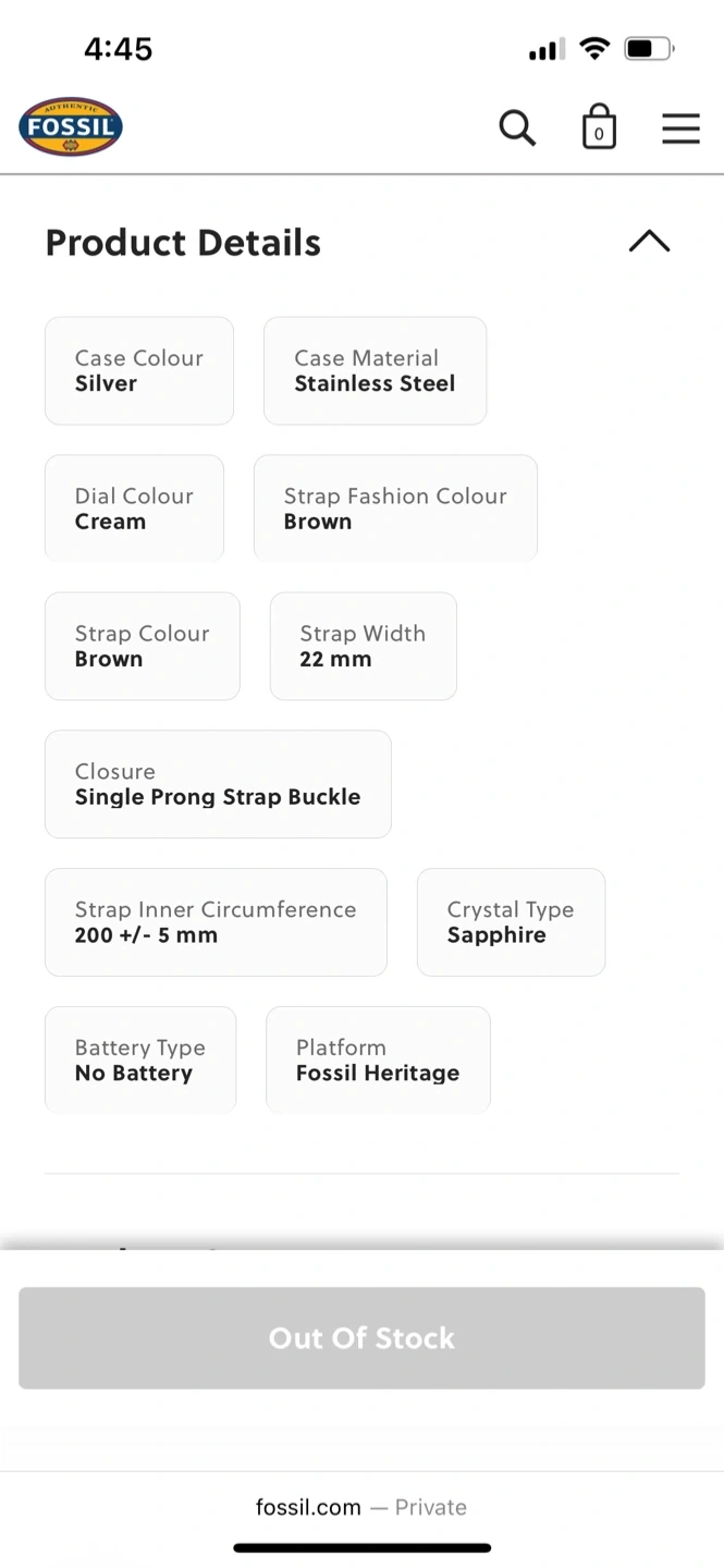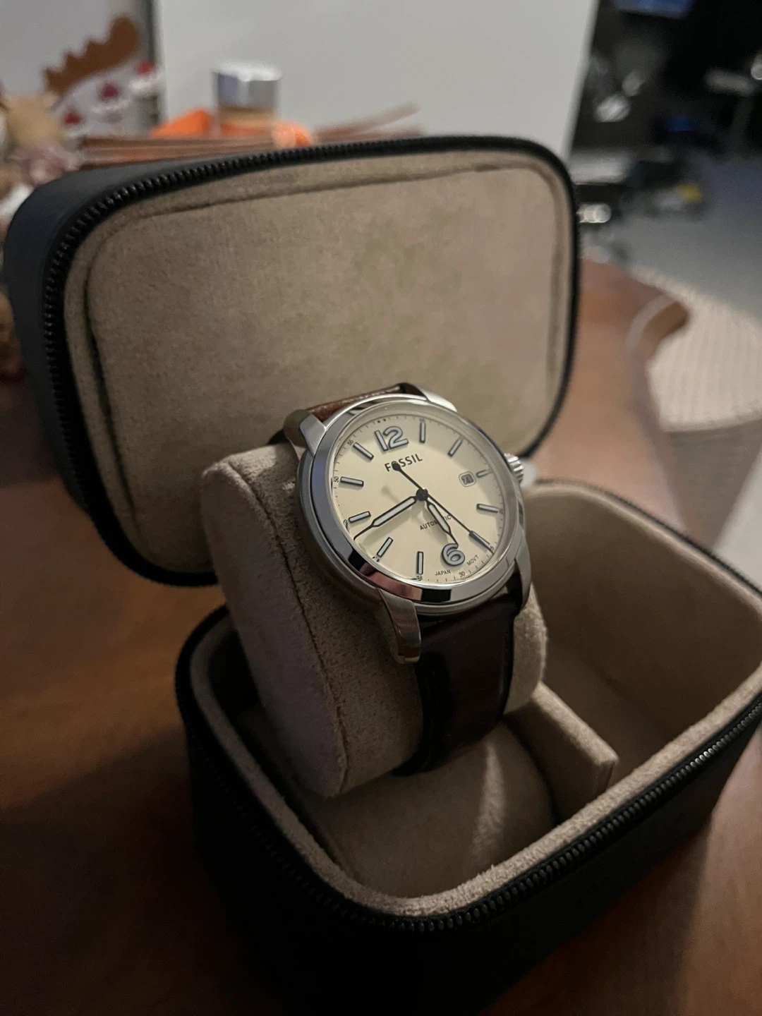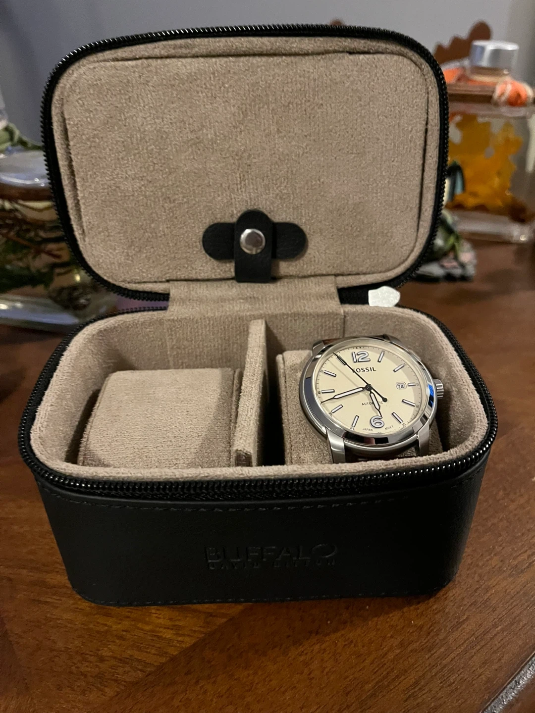 Selling a Fossil Heritage automatic watch! The watch features a cream dial and a brown LiteHide™ leather strap. The case is silver stainless steel. It comes in a Buffalo watch case!