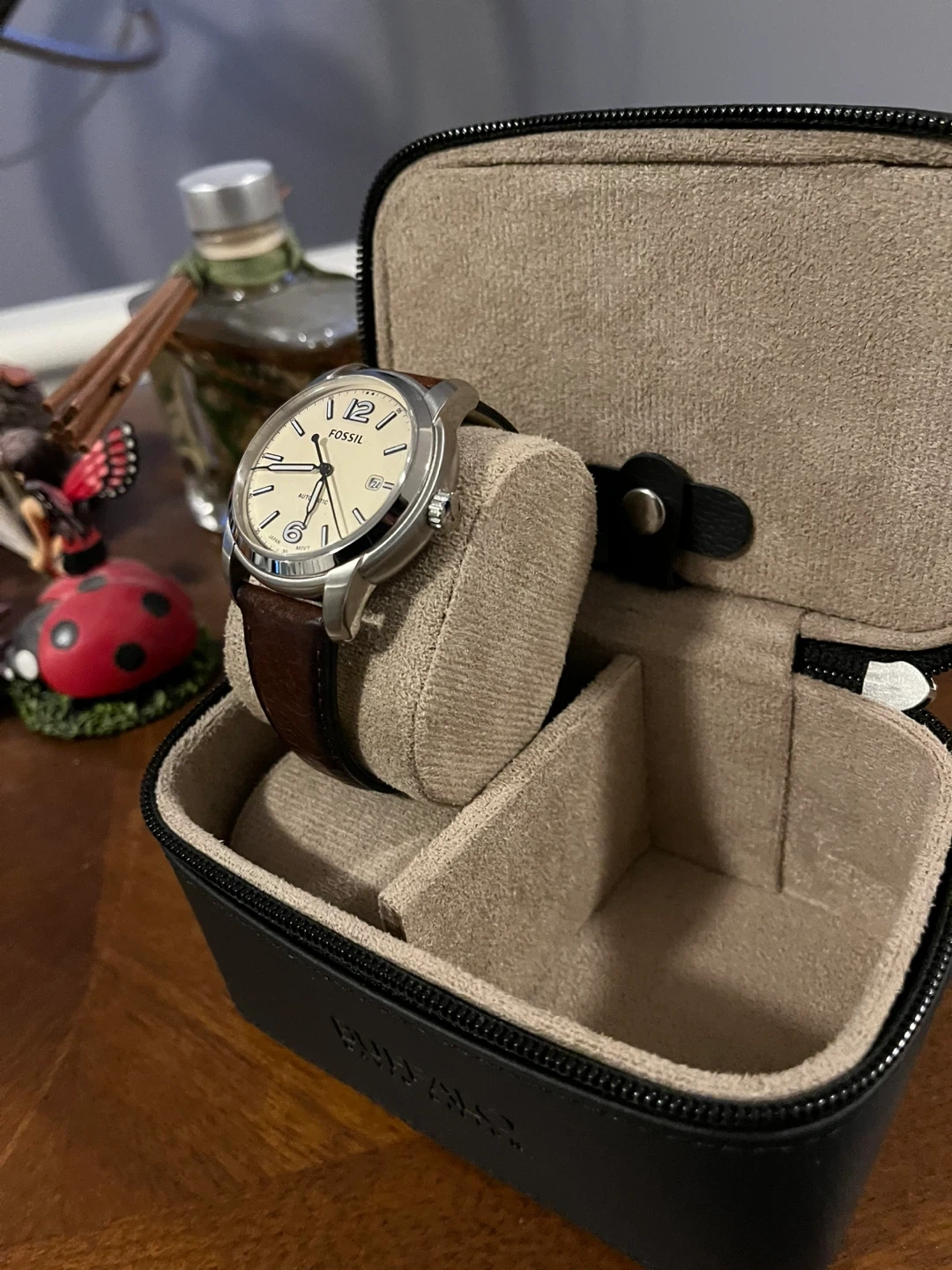 Selling a Fossil Heritage automatic watch! The watch features a cream dial and a brown LiteHide™ leather strap. The case is silver stainless steel. It comes in a Buffalo watch case!