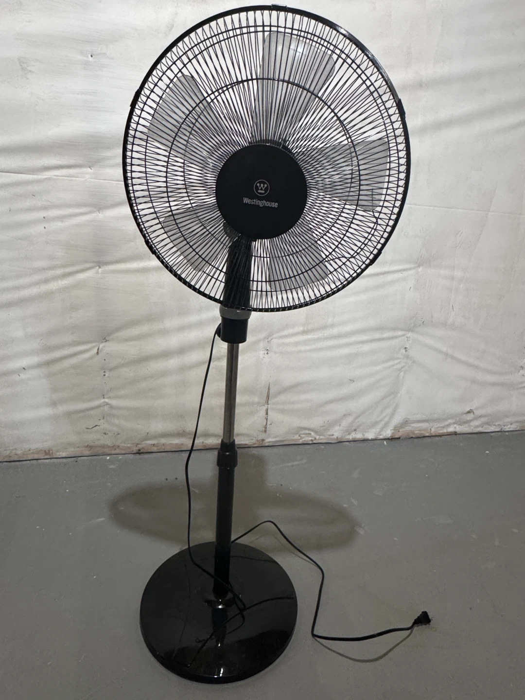 Selling a Westinghouse 16-inch stand fan in great condition! It has 3 speed settings and oscillates. The fan has a 5-blade design. Box included