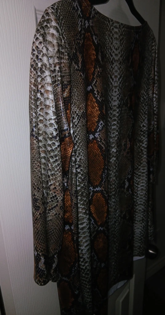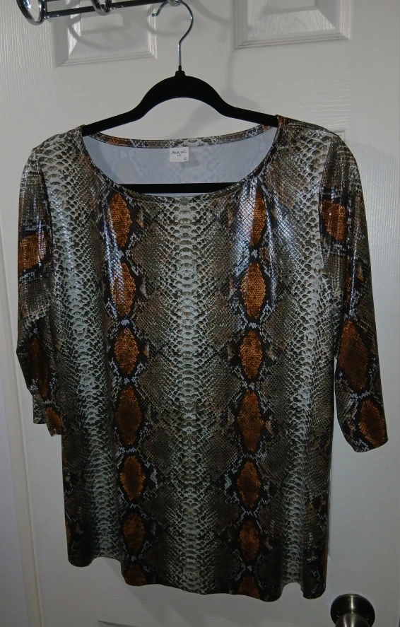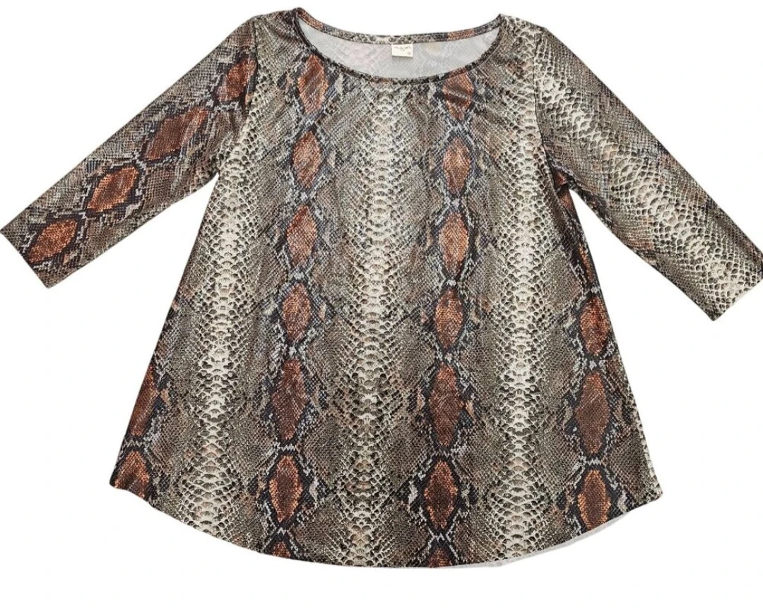 Here's a fun snakeskin print top! The pattern is a mix of browns, tans, and white, giving it a realistic snakeskin look. It's a stylish and unique piece to add to your wardrobe!
