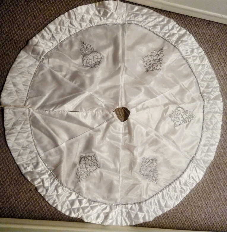 Here's a lovely white Christmas tree skirt! It features delicate silver embroidery and a quilted border. Perfect for adding a touch of elegance to your holiday decor