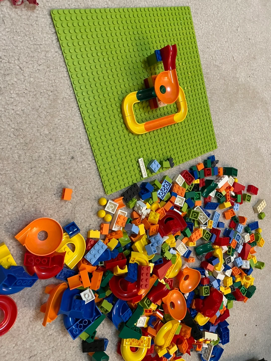This is a Lego-compatible marble run! This set contains 6 funnels + ramps, turns, drops and more! There are over 500 pieces to play with! Baseplate and brick-separator are included.