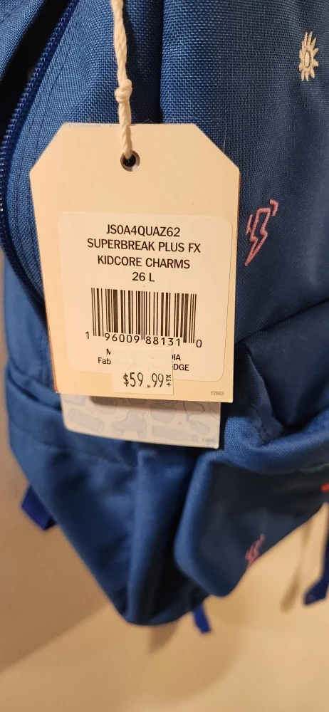 I have a brand new JanSport Superbreak Plus FX backpack for sale! It's a 26L backpack in a lovely blue colour with cute Kidcore Charms. It also features a 15" laptop sleeve and a water bottle pocket.