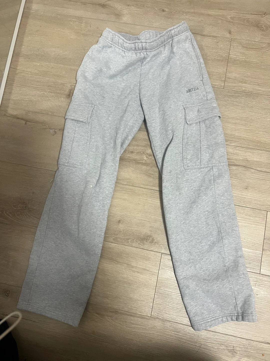 Selling a pair of Aritzia Sweatfleece Cozy Fleece cargo pants in size 2XS! They are a mega fit and a light grey colour. Perfect for lounging around or running errands