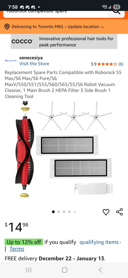 Selling replacement spare parts compatible with Roborock S5 Max/S6 Max/S6 Pure/S6 MaxV/S50/S51/S55/S60/S65/S5/S6 robot vacuum cleaners. Includes 1 main brush, 2 HEPA filters, 3 side brushes, and 1 cleaning tool.