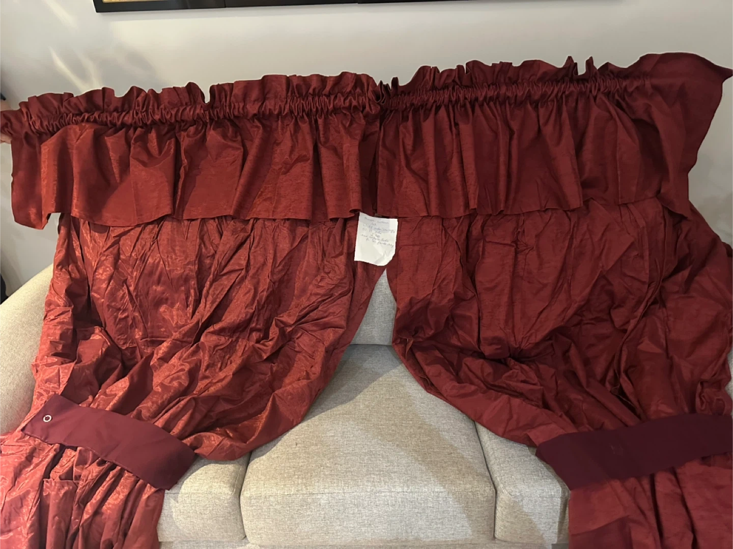 Here's a burgundy window valance with curtains. The color is a rich, deep burgundy. It's in great condition and ready to add a touch of elegance to your home. 2 sets, need curtain hooks for the panels only