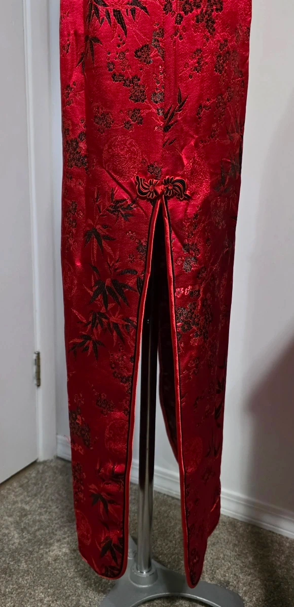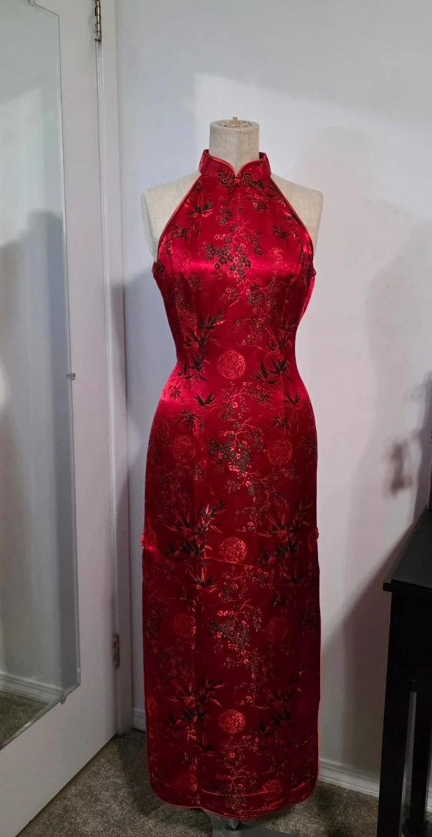 Beautiful red cheongsam dress with a unique design! It's in great condition and ready for a new owner. The dress features a halter neckline and side slits. SIze Asian L which is like a Medium. Dress Form Dimensions: Approximately B 84 cm x W 60 cm x H 90 cm