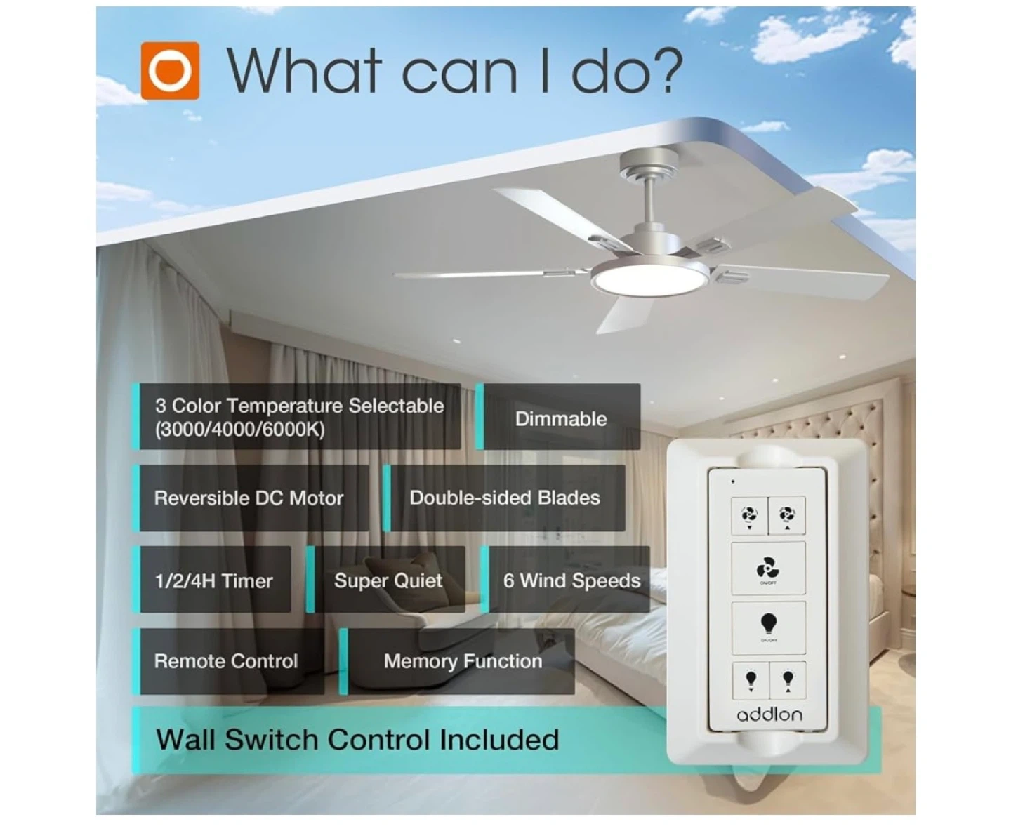 This Addlon ceiling fan has a 52-inch blade span and comes with a remote control. It features: - 3 colour temperature selectable options (3000K/4000K/6000K) - 6 speeds selectable - Reversible DC motor for summer and winter use - Wall switch control is included