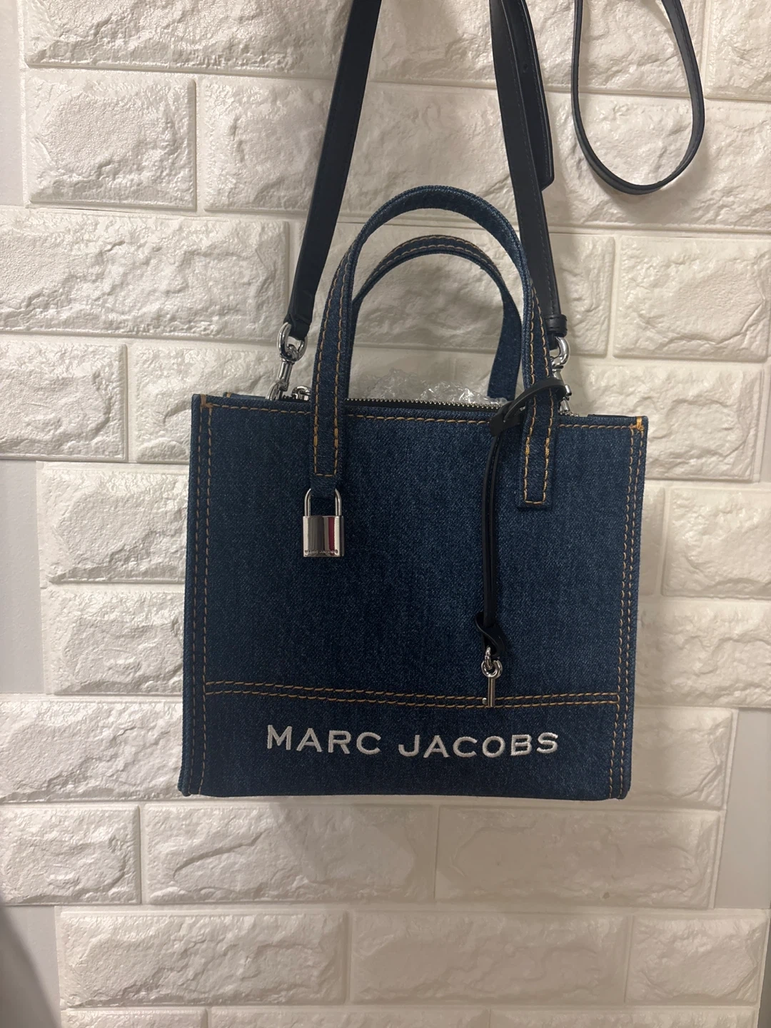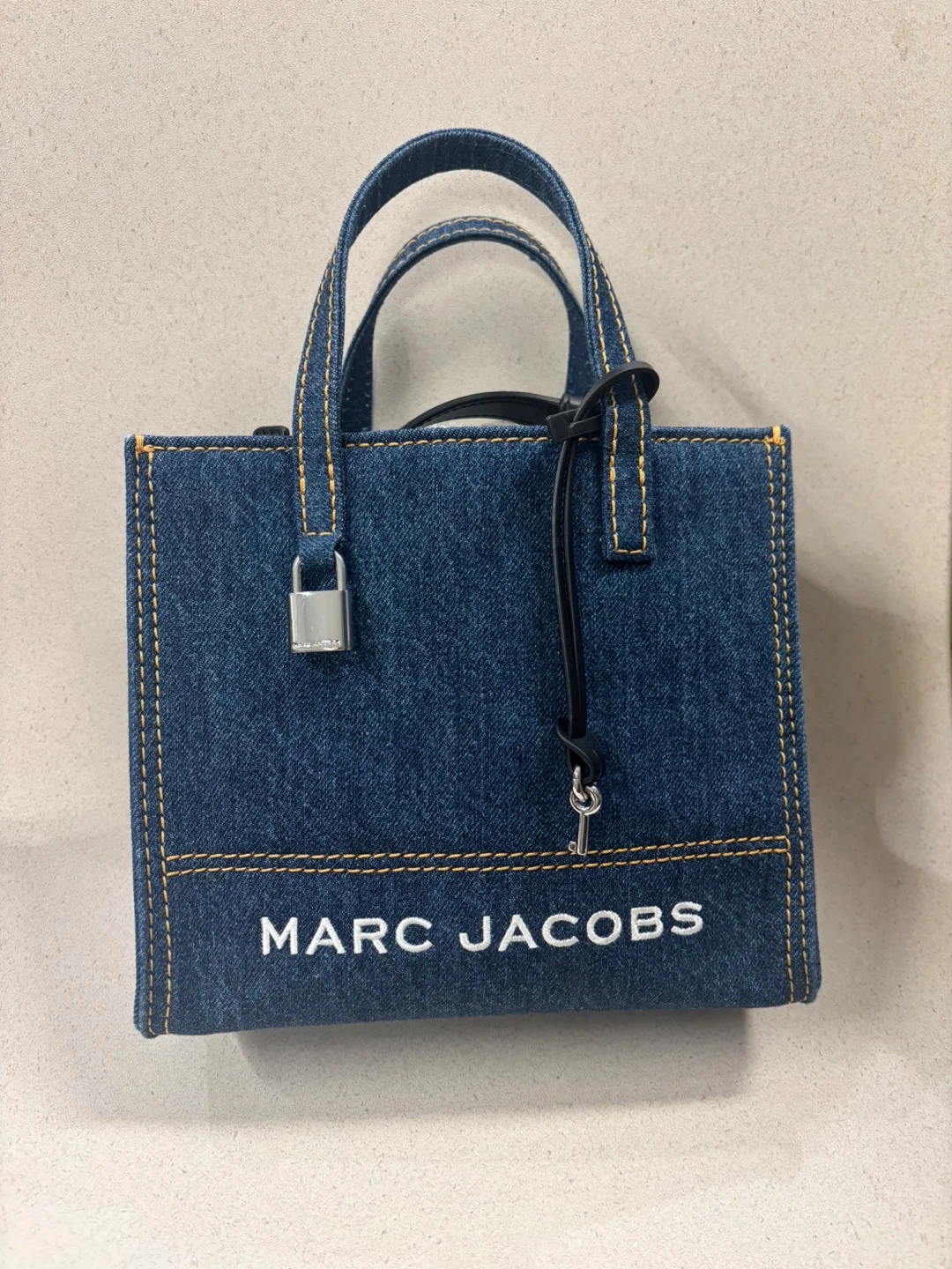 Selling a cute Marc Jacobs denim mini tote bag! It's in great condition and perfect for everyday use. The bag features the Marc Jacobs logo on the front and has a lock and key detail. It also comes with a detachable shoulder strap for added convenience