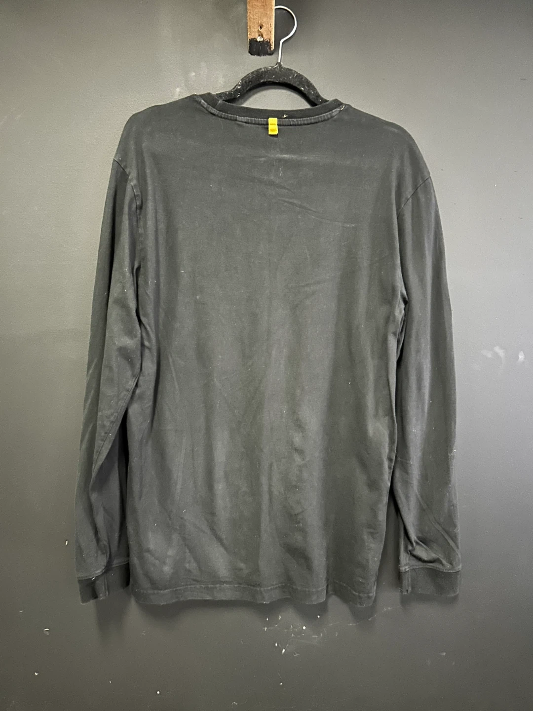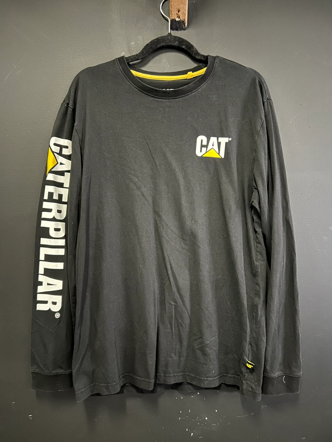 CAT long sleeve shirt in black. It's made of 100% cotton. The shirt features the CAT logo on the front and the word "CATERPILLAR" down the sleeve