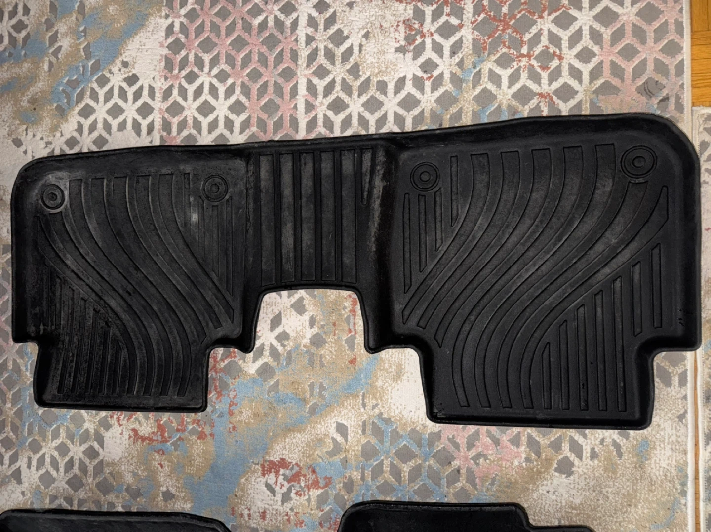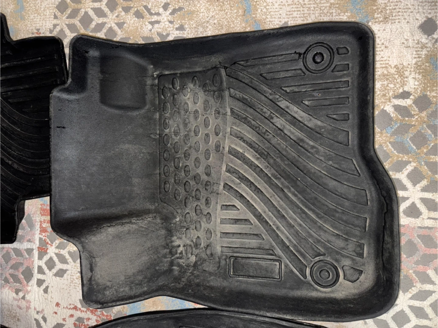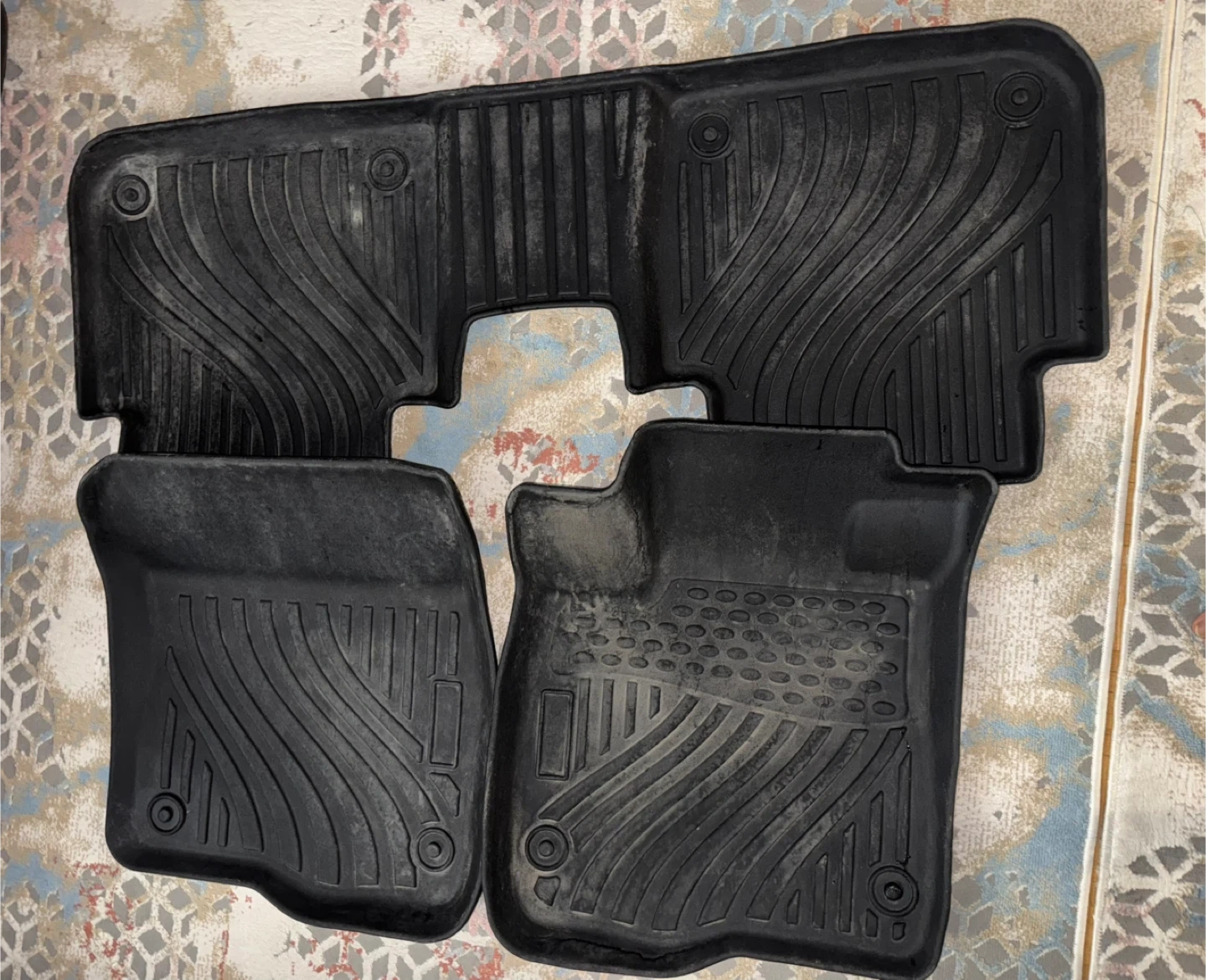 Selling a set of used black rubber car floor mats. They show some signs of wear from use, but still have lots of life left!
