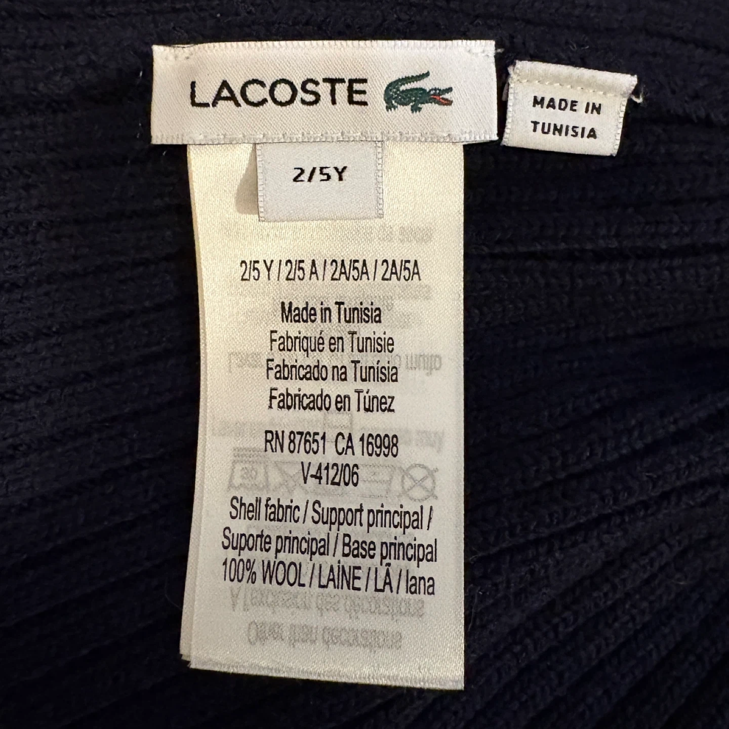 Lacoste Kids Navy Blue Rib Knit Wool Logo Beanie Hat Size 2/5Y