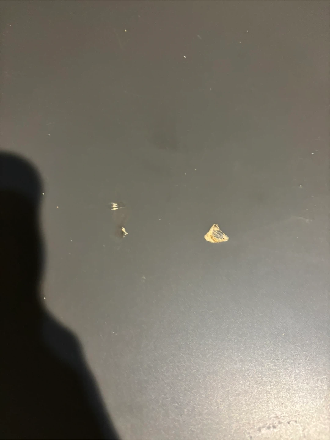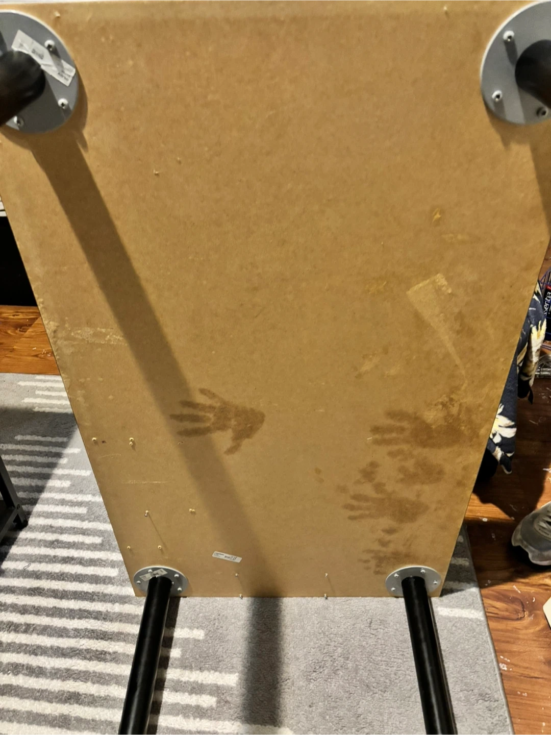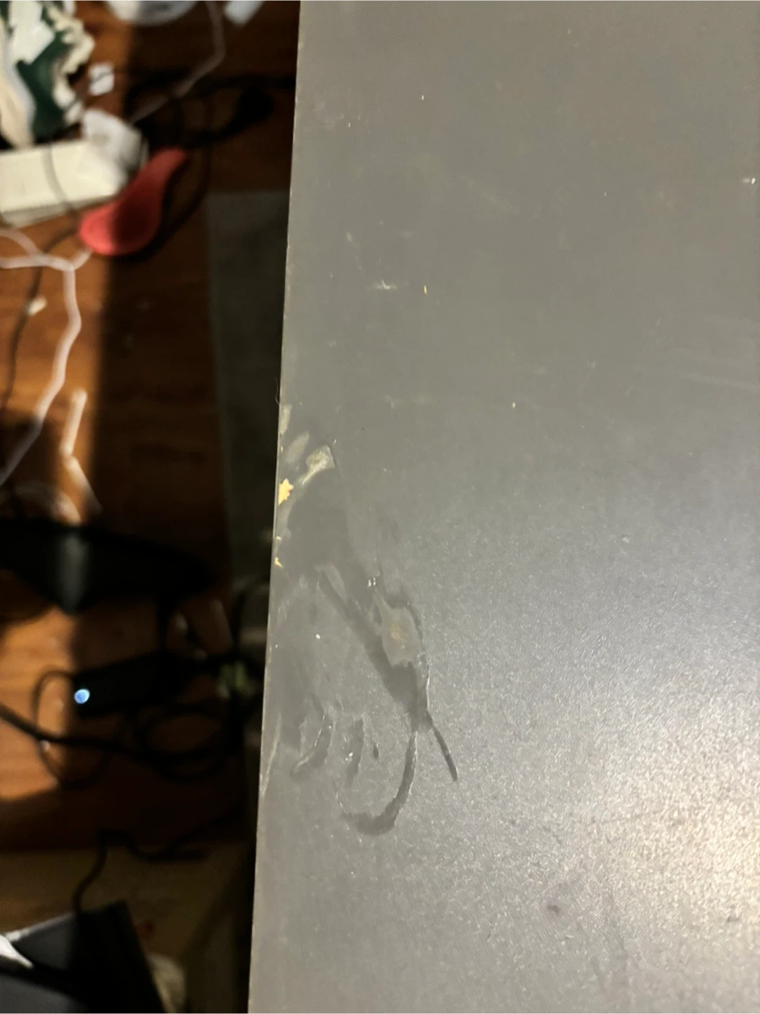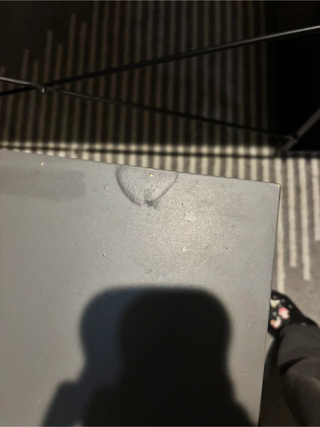Giving away a gray desk featuring black legs. It has some signs of use, including a few scratches and marks on the surface. Please take a look at the pictures for details!