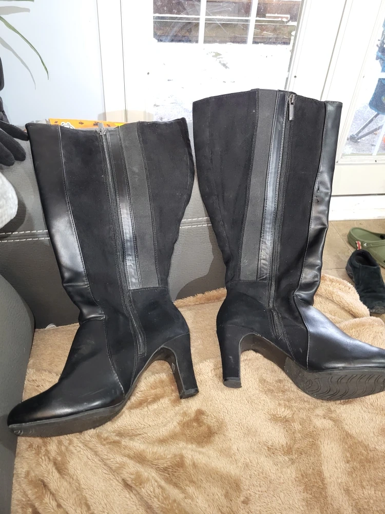 Selling a pair of black knee-high boots. They're in good condition and are a size 8.5W (US). The boots are made of synthetic materials and have a stylish design with a zipper on the side. Perfect for adding a touch of elegance to any outfit!