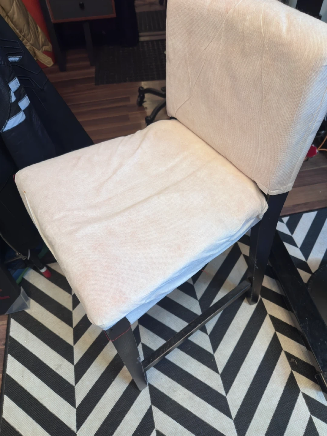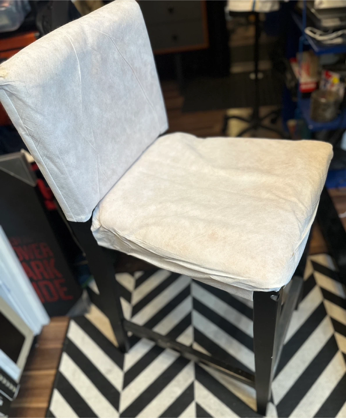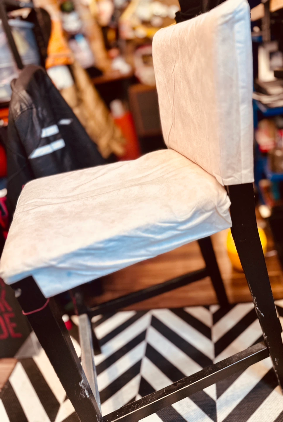 Free bar stool sturdy seat and back , black wood frame. Seat height is 23” Missing chair cover, it’s a parsons style chair, easy to find covers for it.