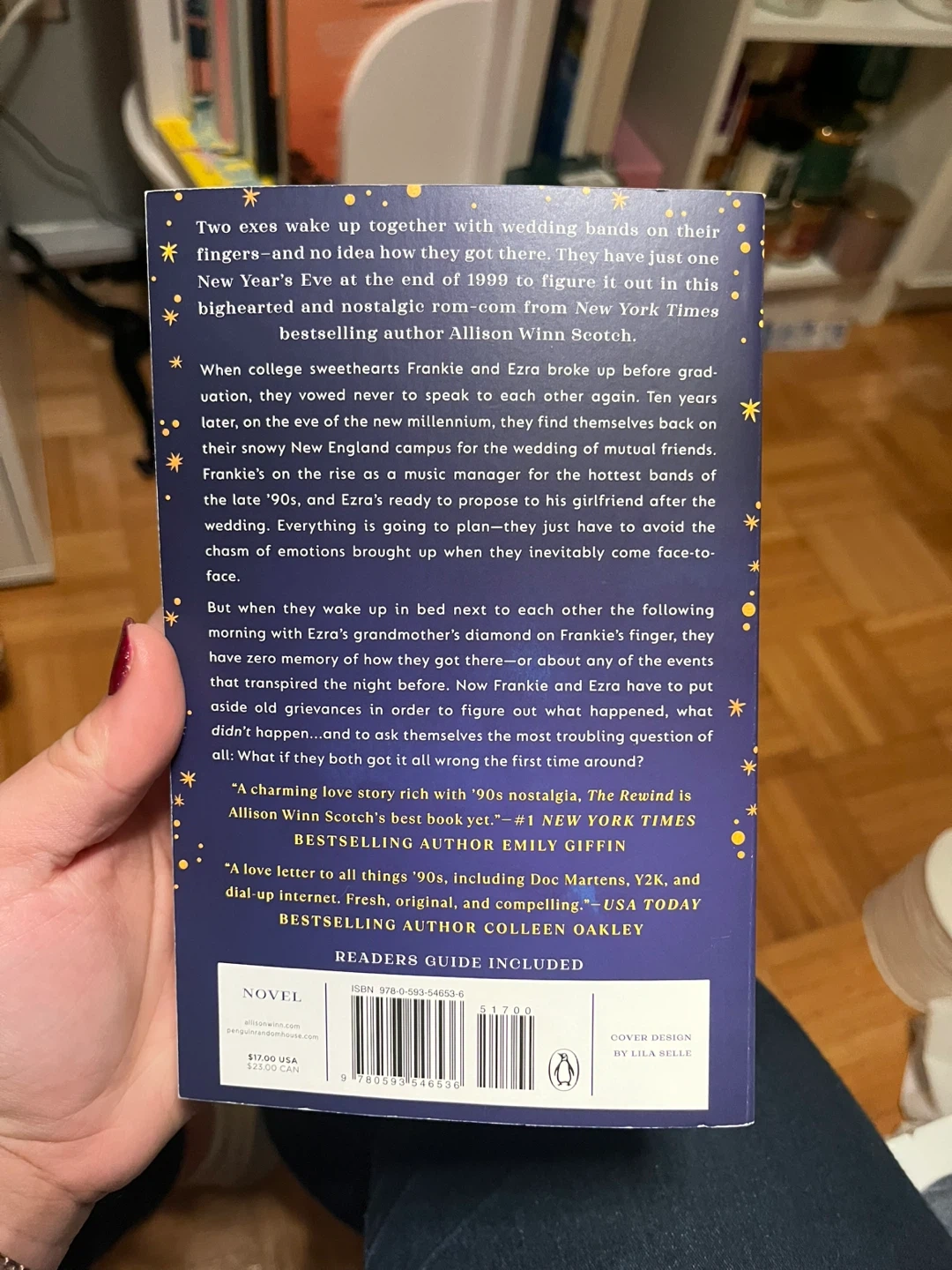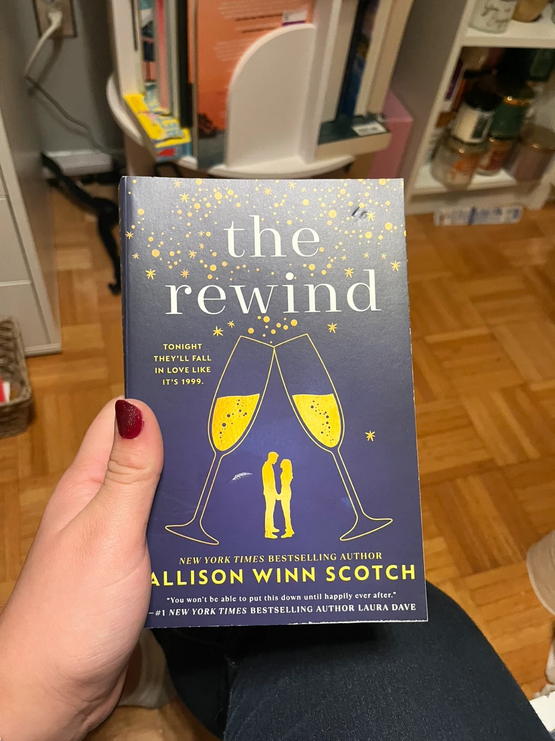Selling "The Rewind" by Allison Winn Scotch. It's a novel that promises a charming love story with '90s nostalgia. Perfect for a cozy read!