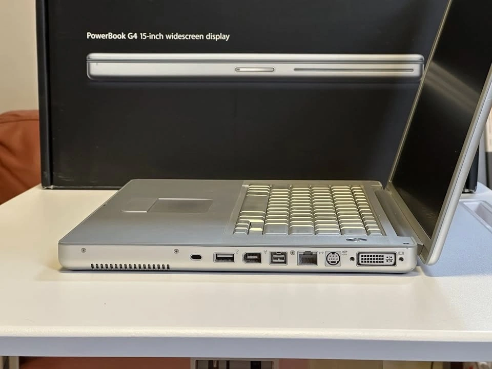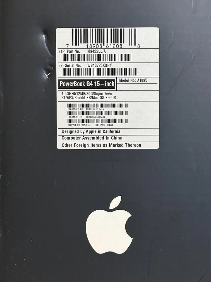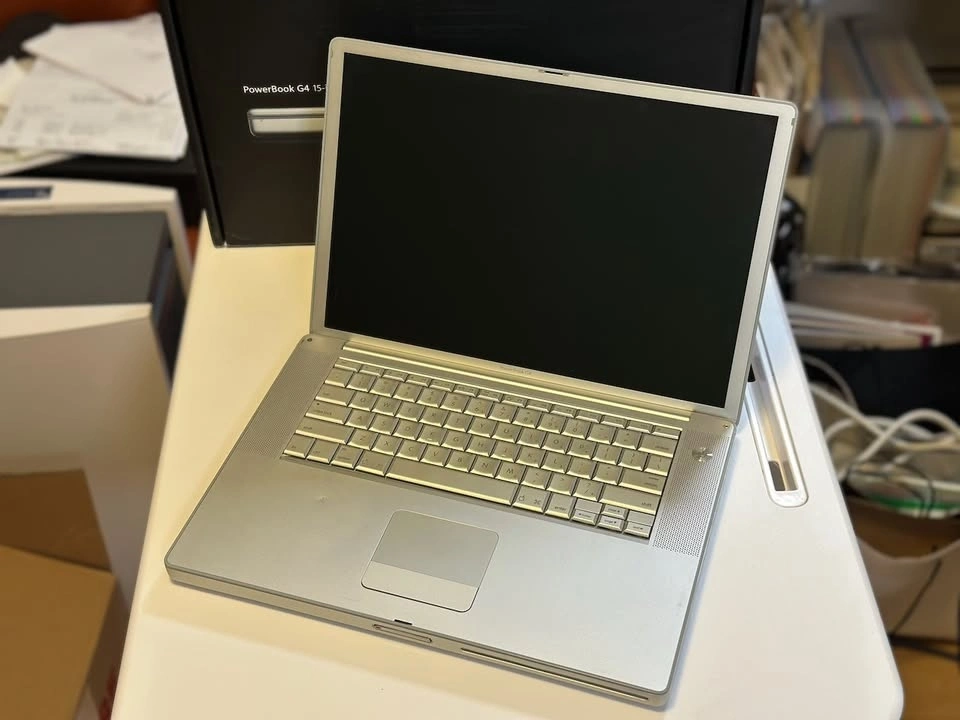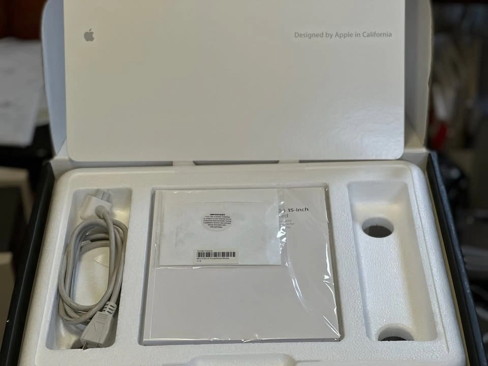 This PowerBook was my main work computer from 2004. It features a 1.5 GHz PowerPC G4 processor, 512 MB+ of RAM, an 80 GB hard drive, and a 15.2-inch display. All of the original packaging and box are included. The power brick is missing one of its wings. Asking $50 obo.