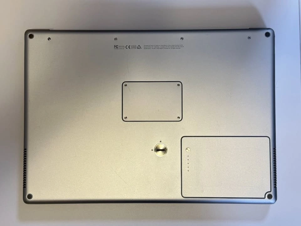 The PowerBook was dropped back in the day, unfortunately denting the corner right by the power port. This makes charging/powering up the PowerBook difficult. I fiddled with it a bit, but couldn't maintain a connection reliably enough to turn it on. You can probably flatten the frame there to power it up again, or just use everything for parts or display.
