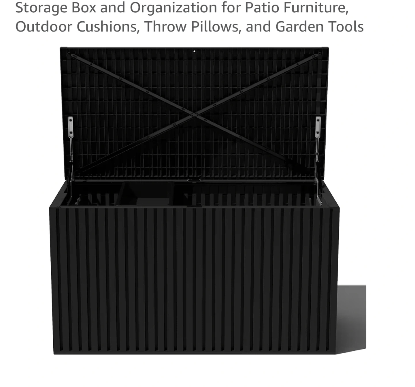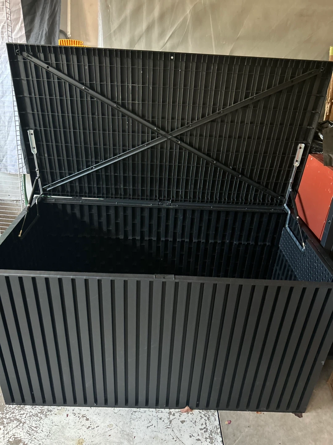 Selling a black outdoor storage box, perfect for patio furniture, cushions, throw pillows, and garden tools! It's 48 inches long, 24.5 inches wide, and 27 inches high.