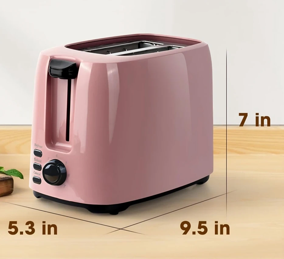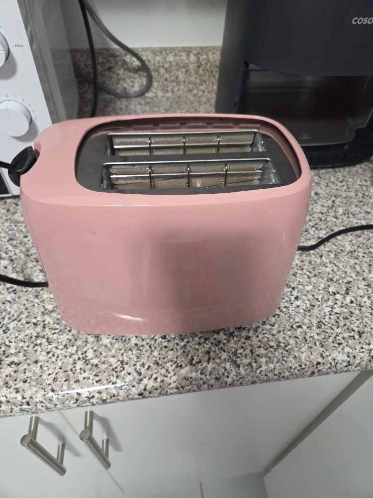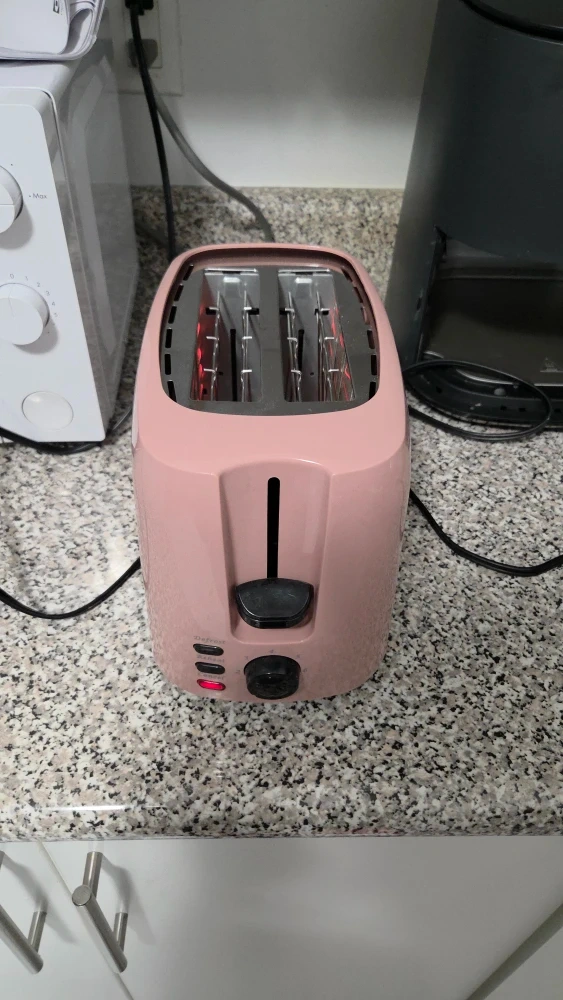 Selling a pink toaster! It's in great condition and would look lovely in any kitchen. It has defrost, reheat, and cancel functions. Has a crumb tray as well. The dimensions are approximately 7 inches high, 5.3 inches wide, and 9.5 inches deep. Final sale, no returns or exchanges.