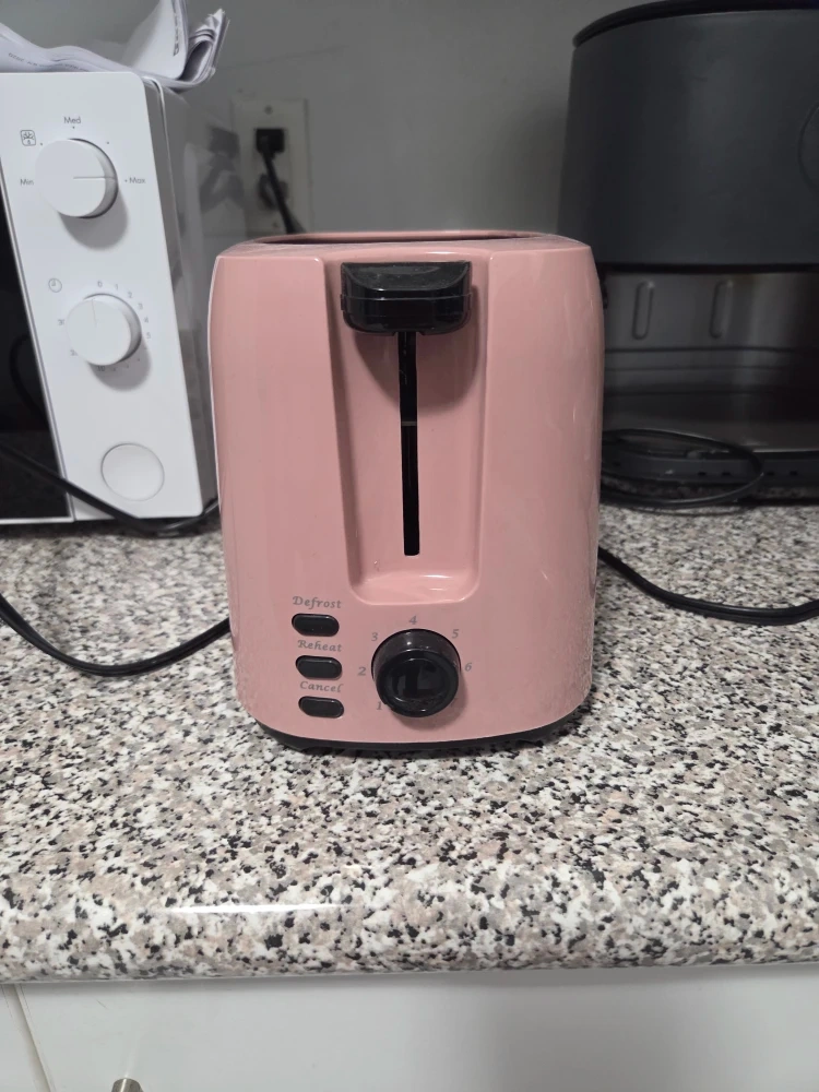 Selling a pink toaster! It's in great condition and would look lovely in any kitchen. It has defrost, reheat, and cancel functions. Has a crumb tray as well. The dimensions are approximately 7 inches high, 5.3 inches wide, and 9.5 inches deep. Final sale, no returns or exchanges.