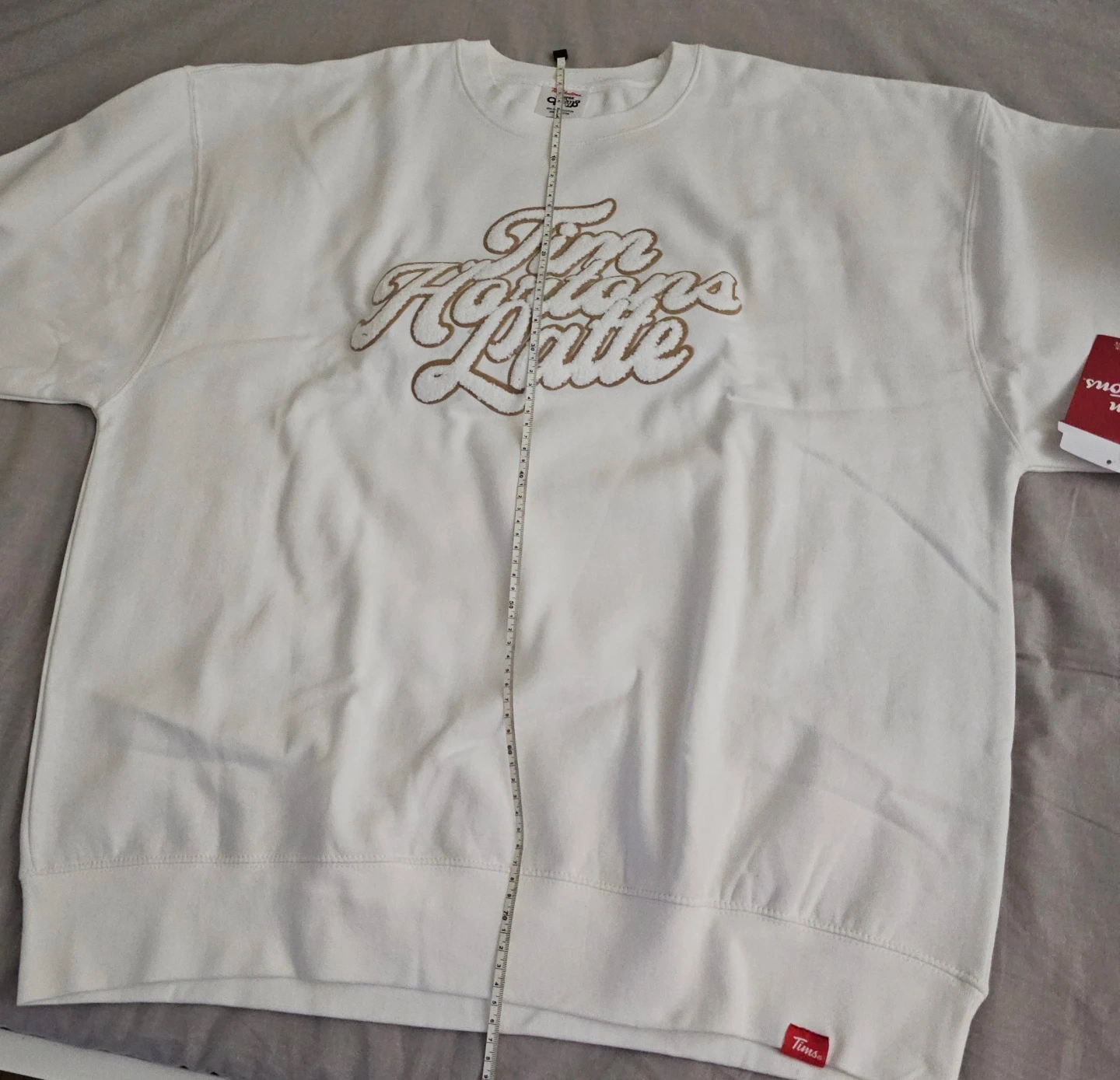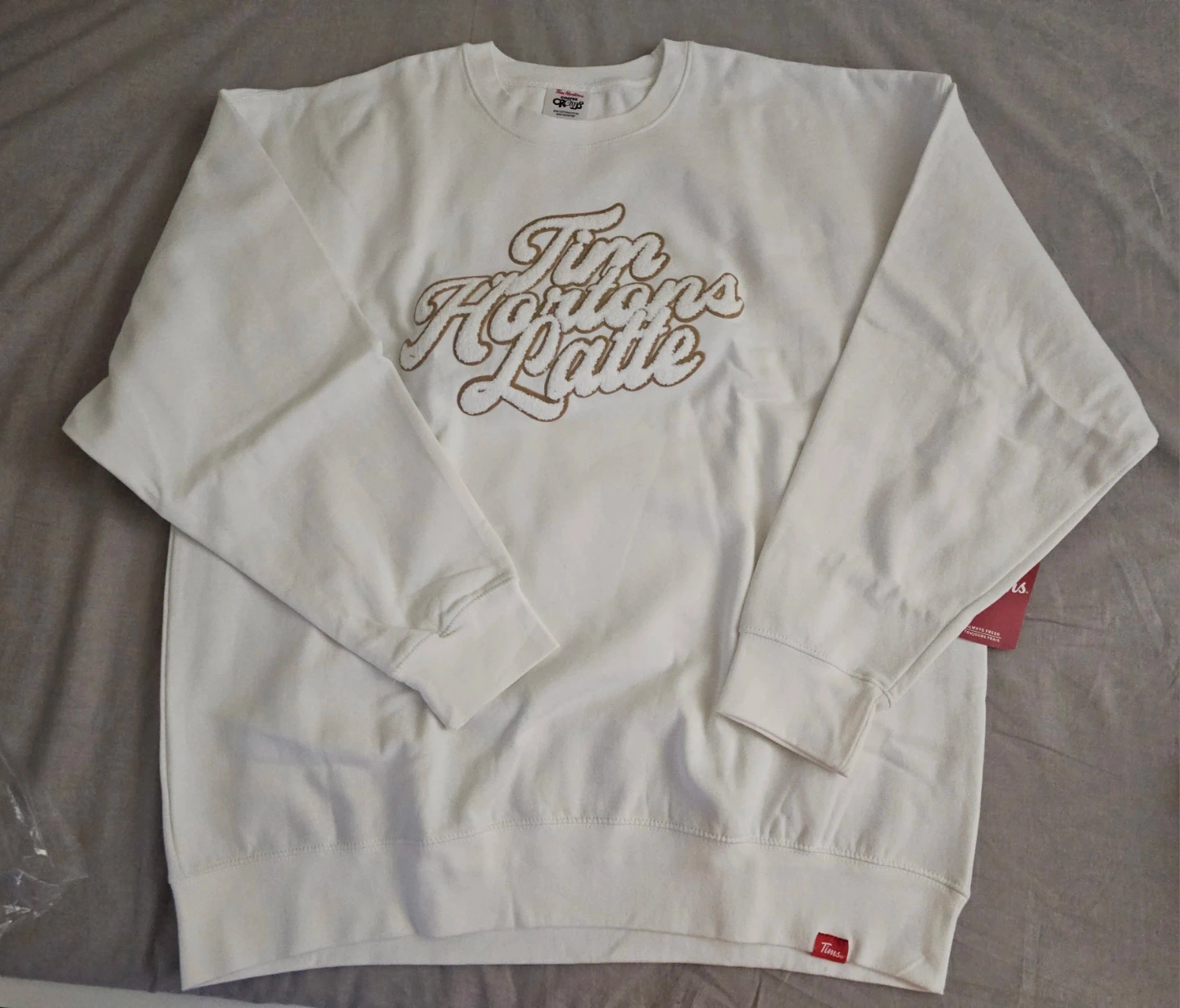 I have a brand new Tim Hortons Latte crewneck sweatshirt for sale! It's a crisp white colour with the Tim Hortons Latte logo embroidered on the front. Perfect for any Tim Hortons fan!