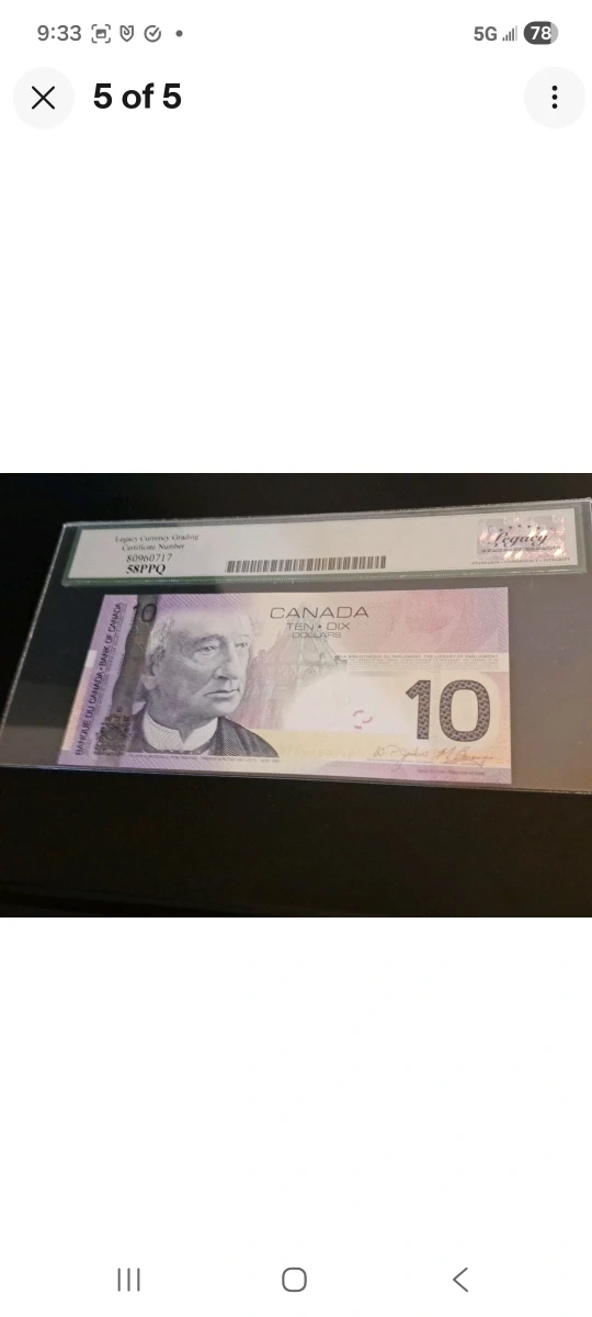 Selling a Legacy Currency Grading graded $10 Canadian bill. The grading number is 58PPQ. This three digit radar note is beautiful scarce and one of a kind. This note can be shipped Canada wide with tracking for an extra $20 worry free. Enjoy this unique rare note!