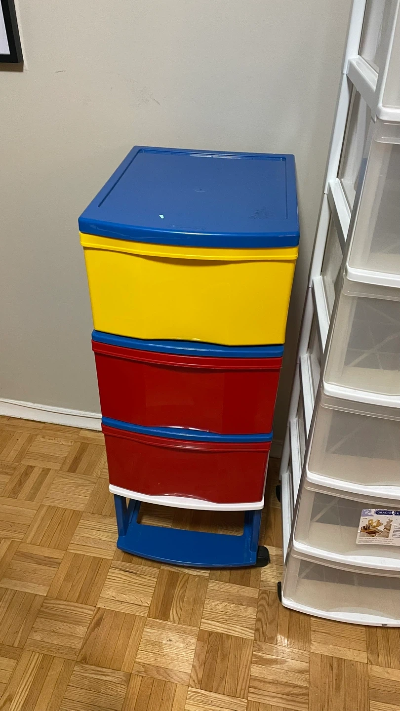 Here's a colourful 3-drawer rolling cart by Storage Living! The drawers are yellow, red, and white, and the frame is blue. It's perfect for organizing toys, crafts, or office supplies. It's in great condition and ready to roll into your space