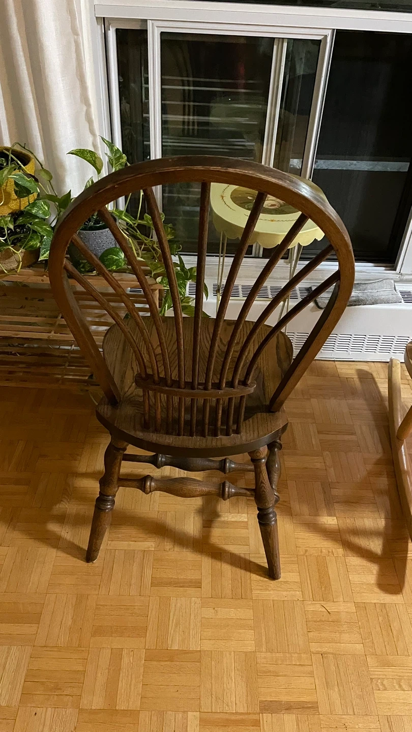 Selling a wooden Windsor style chair. It's a sturdy and classic piece of furniture that would look great in any home. The chair is in good condition and ready for a new space!