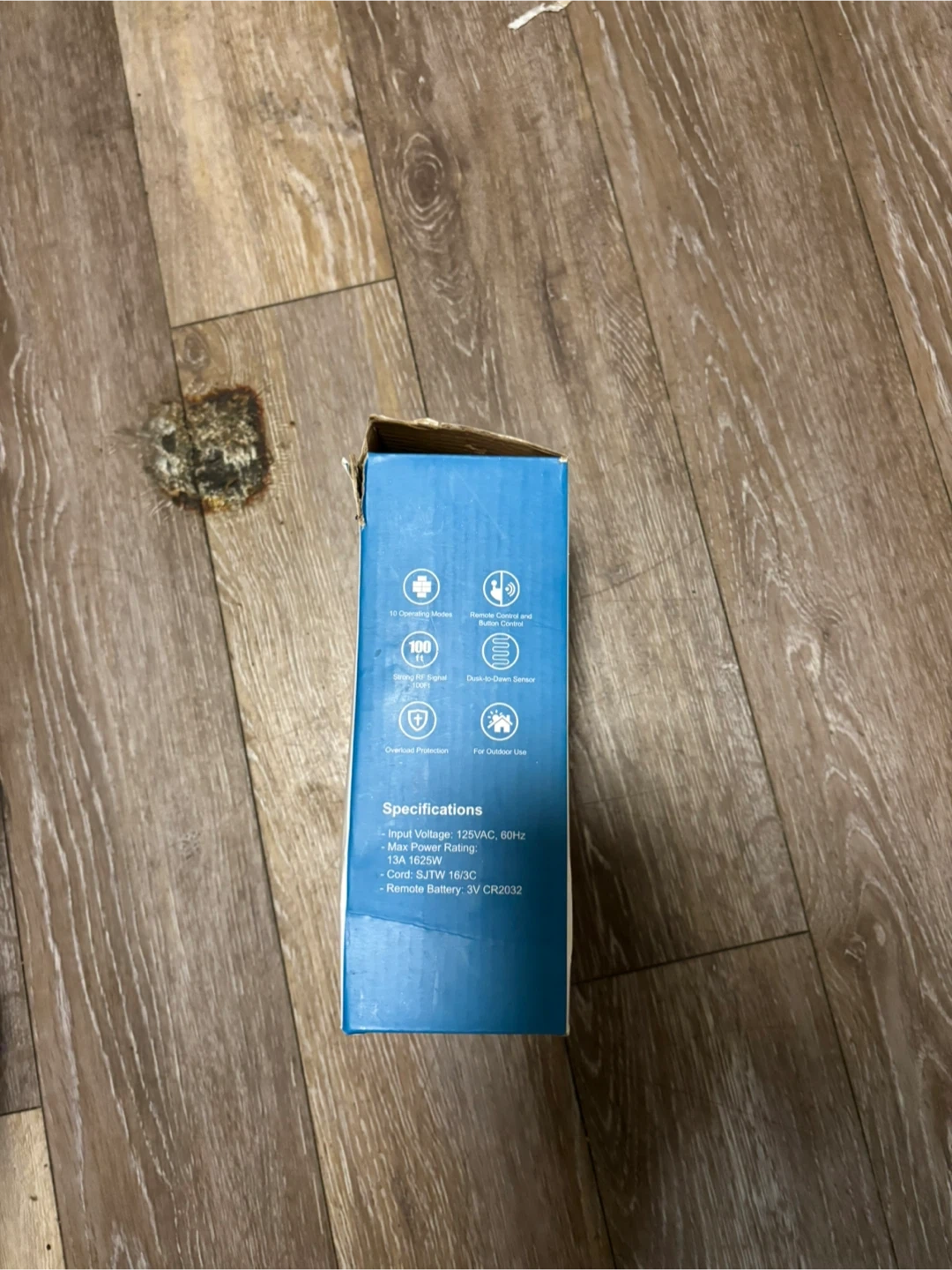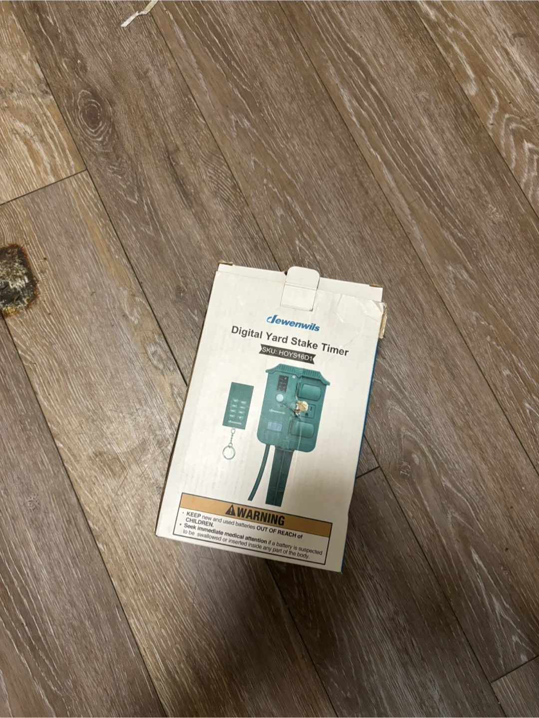 Selling a Jewewils digital yard stake timer. It has overload protection and is built-in even sense. It is also suitable for outdoor use. The specifications include: Input Voltage: 125VAC, 60Hz, Power: 1625W, Remote battery: 3V CR2032. Includes the box