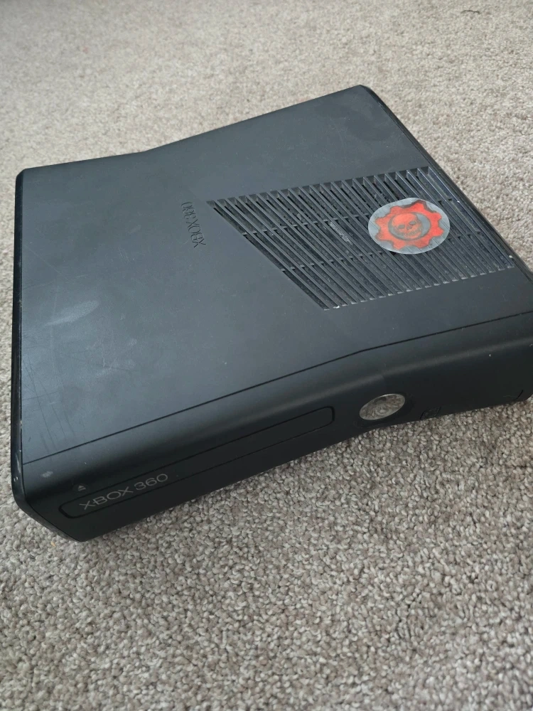 Selling an Xbox 360 console. It comes with two controllers, a headset, and a charging dock. There's a Gears of War sticker on the console. Please note that there is some damage to the console's vent outside. Works fine