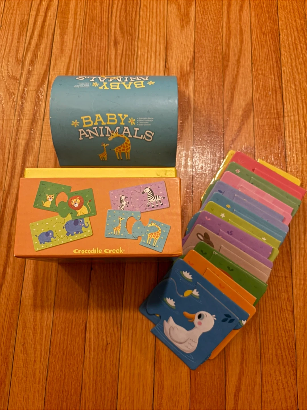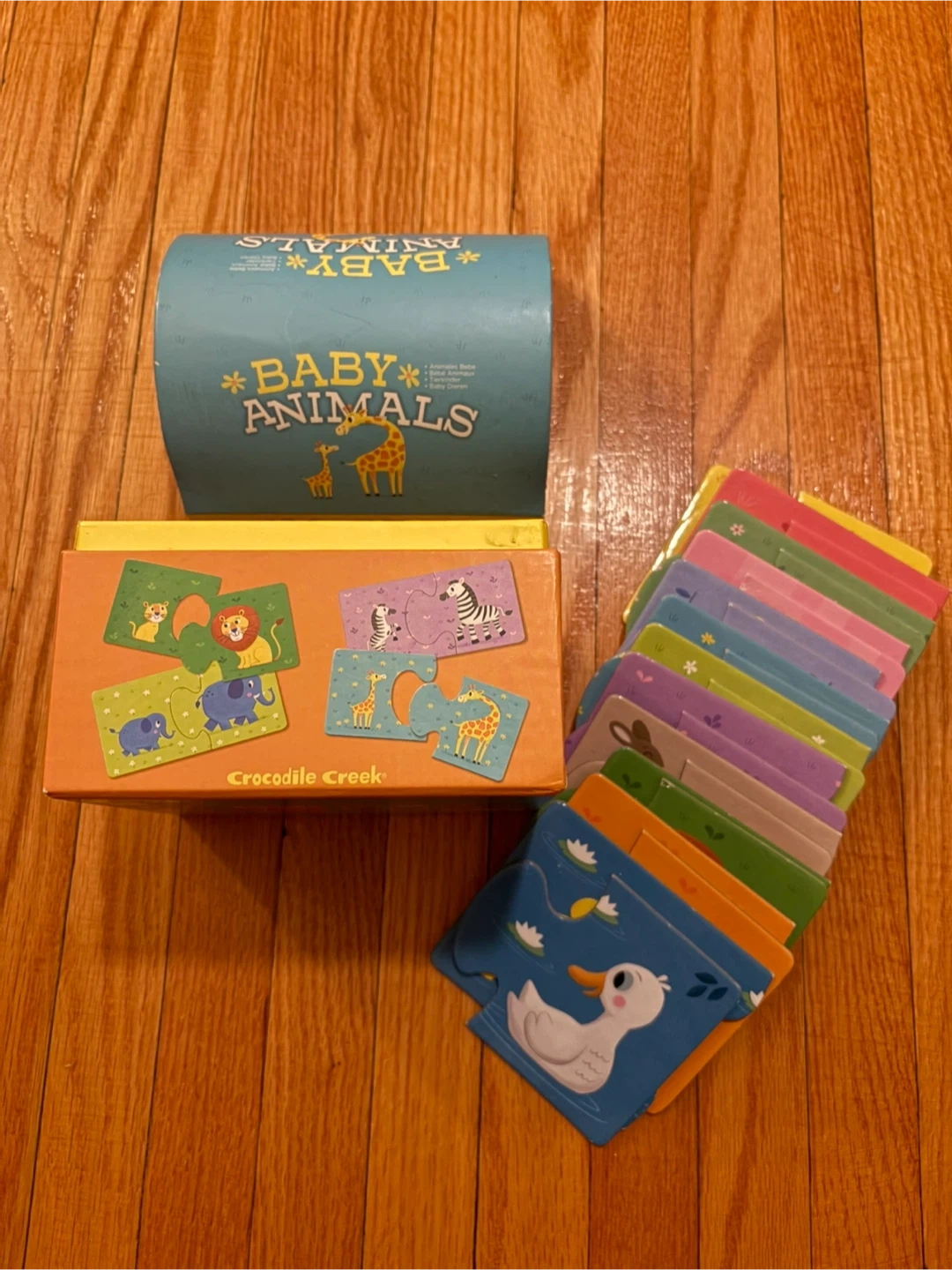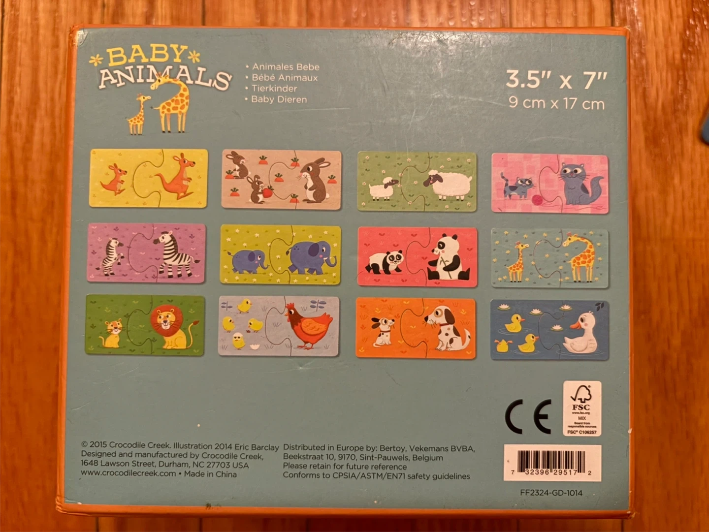 This is a cute Crocodile Creek Baby Animals puzzle set with 12 puzzles in the box! The set includes a variety of animal puzzles, perfect for toddlers and preschoolers practicing dexterity, matching, and learning about animals.
