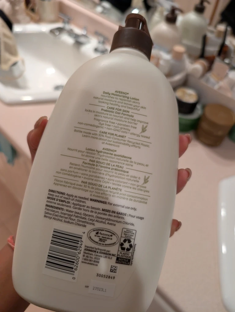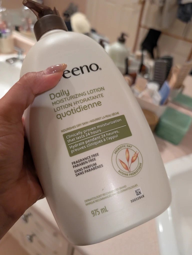 Selling a bottle of Aveeno Daily Moisturizing Lotion. It's a large 975 ml bottle, perfect for keeping your skin nourished and hydrated. This lotion is clinically proven to moisturize for 24 hours and is fragrance-free. It's also formulated with prebiotic oat to help replenish your skin's natural moisture