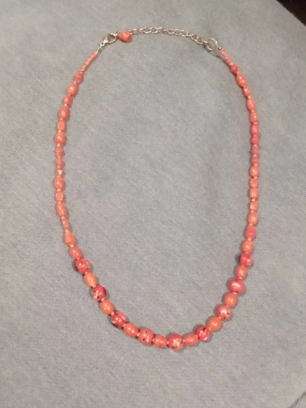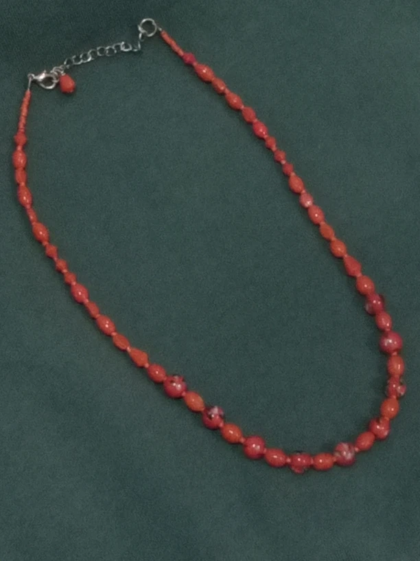 This is a Beautiful Red Mediteranian Coral and Murano beaded necklace. It has Sterling Silver chain and a small heart charm at the clasp. It's in great condition and ready to wear!