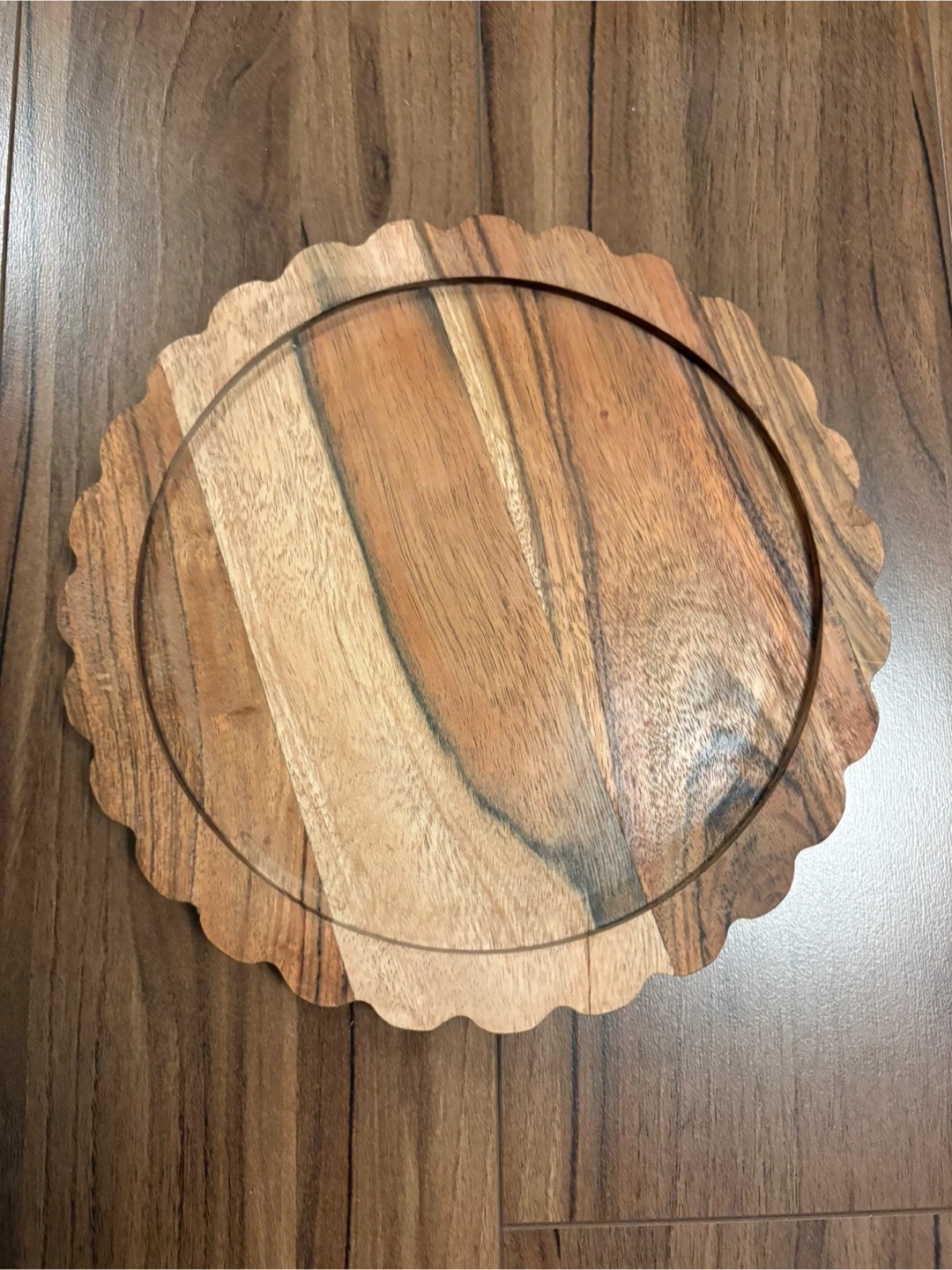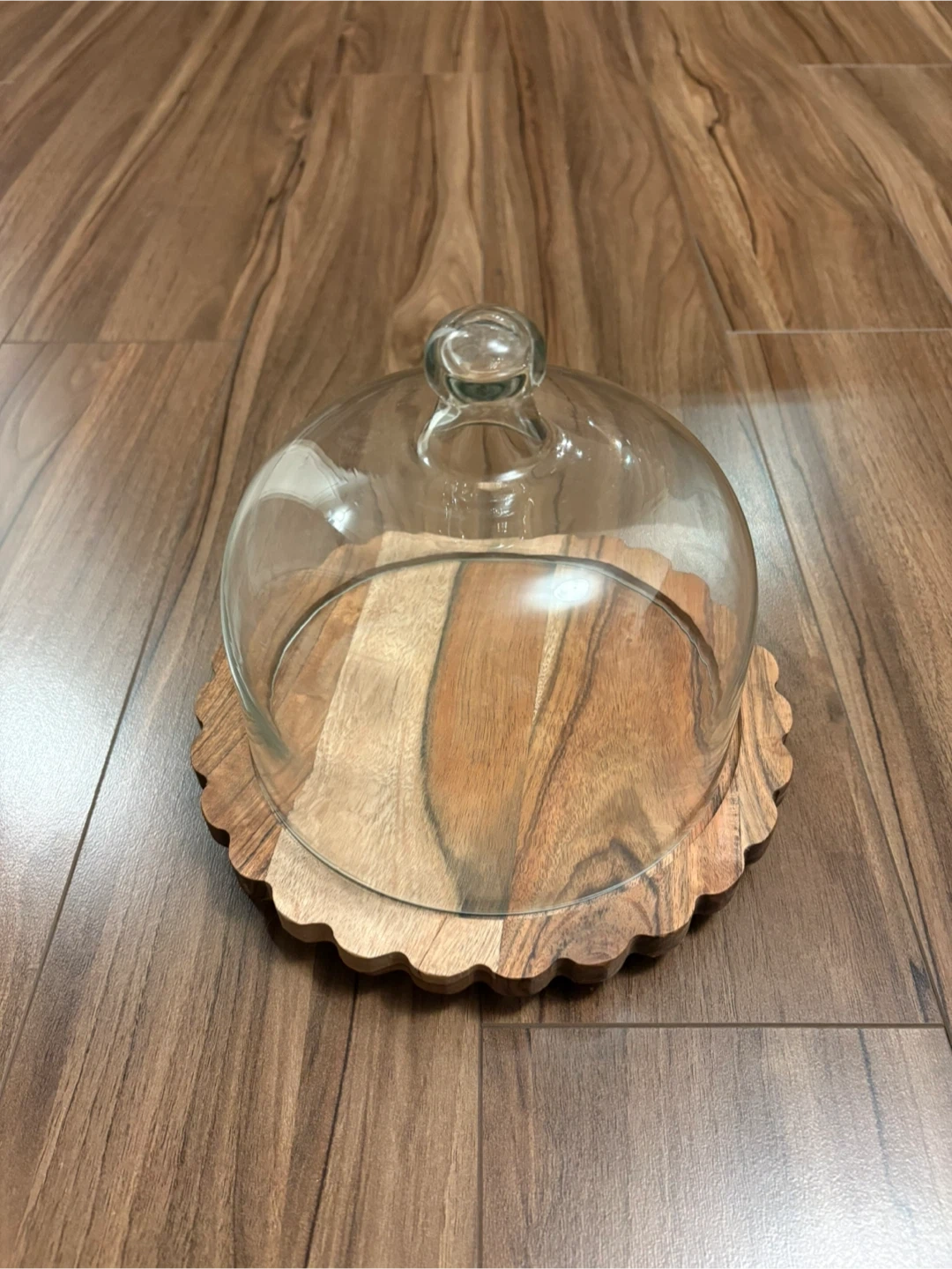 Selling a lovely acacia wood serving plate with a glass dome. It's perfect for displaying cakes, cheeses, or other treats. The plate has a beautiful scalloped edge and the glass dome keeps everything fresh.