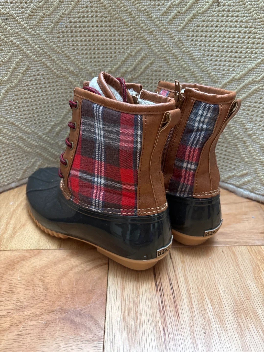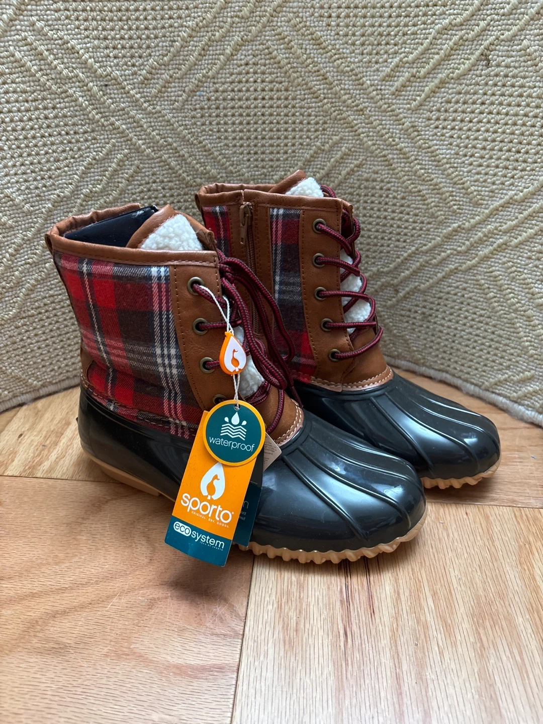 These Sporto duck boots are perfect for keeping your feet dry and stylish! They feature a fun plaid pattern and a waterproof design. Great for rainy days!
