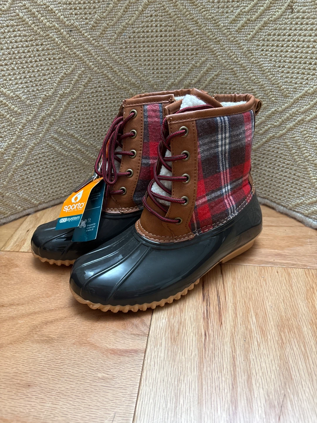 These Sporto duck boots are perfect for keeping your feet dry and stylish! They feature a fun plaid pattern and a waterproof design. Great for rainy days!