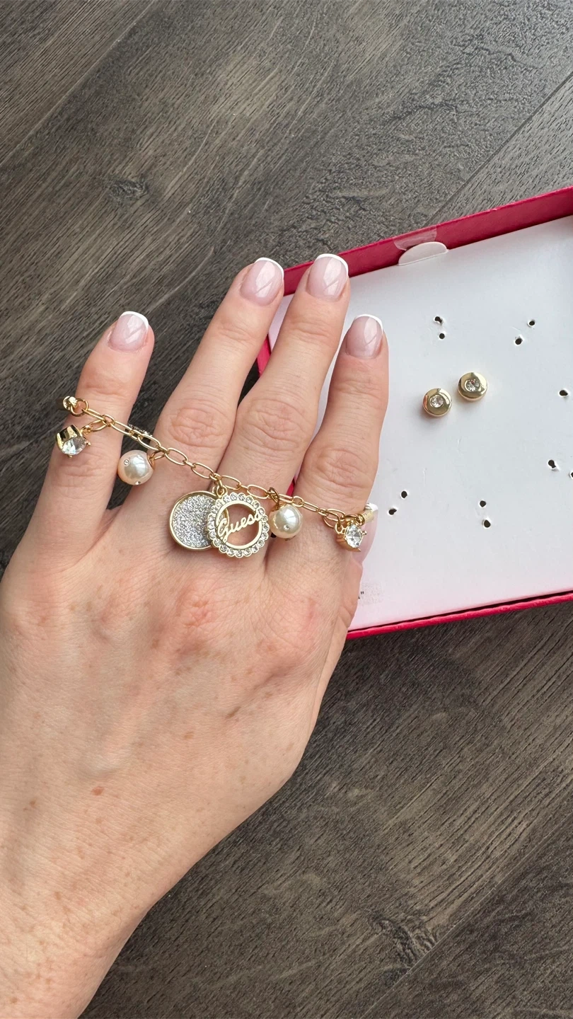 Selling a cute Guess charm bracelet and stud earrings set! The bracelet has a variety of charms, including pearls and a 'Queen' charm. Comes in the original Guess box, perfect for gifting or keeping for yourself
